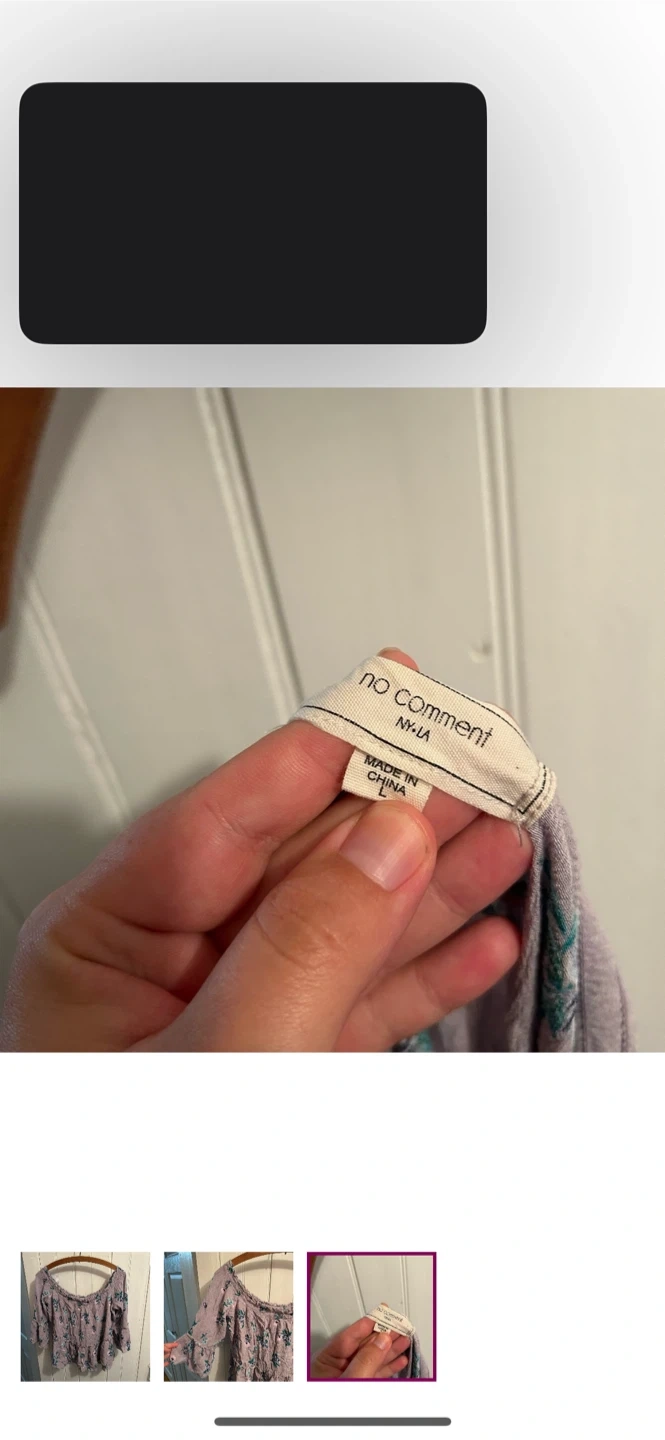No comment brand. Off the shoulder flare sleeve blouse. Purple floral. Size large. Brand new condition