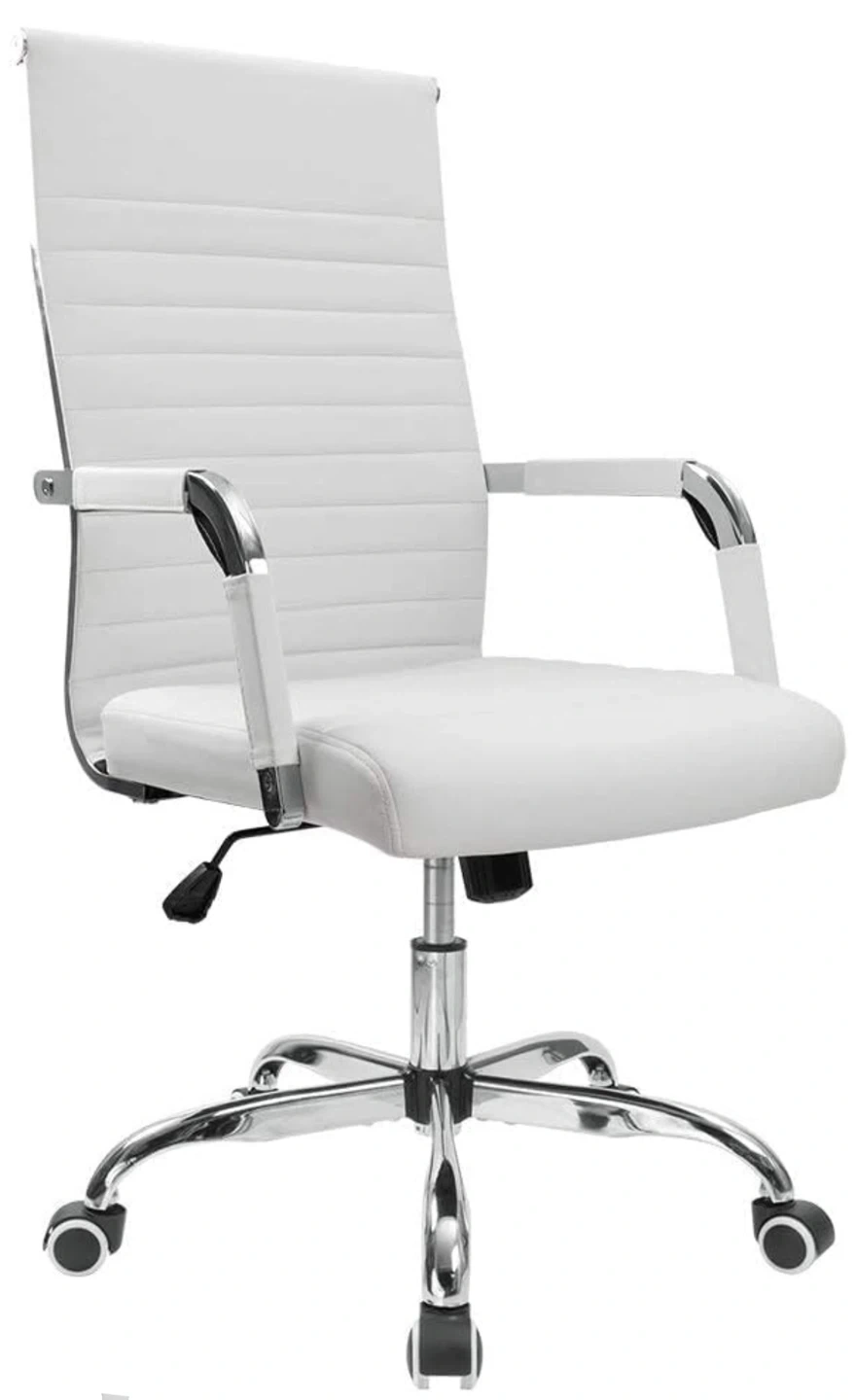 Selling a white ribbed office mid-back chair! It features a rocking function and height adjustment. It also has 360 degree free rotation. The dimensions are 18.1" x 25.7" x 19.1" x 19.7". It can hold up to 280lbs