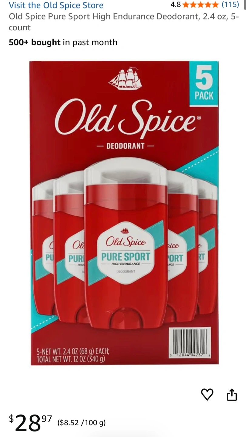 Selling a 5-pack of Old Spice Pure Sport High Endurance deodorant! Each deodorant is 85g.