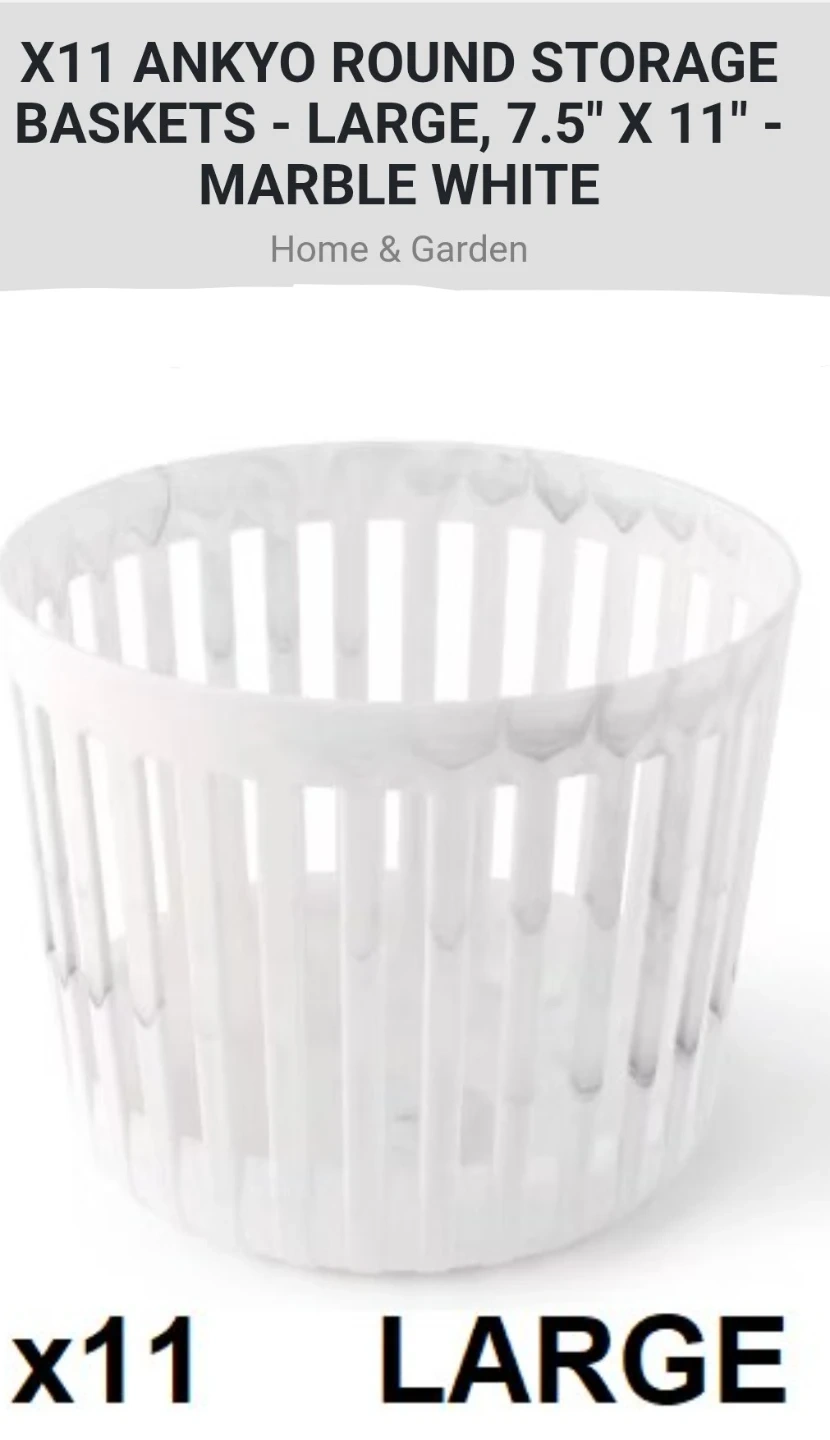 Selling a set of 11 brand new ANKYO round storage baskets in a large size. They're a marble white colour and measure 7.5" x 11". Perfect for organizing your home!