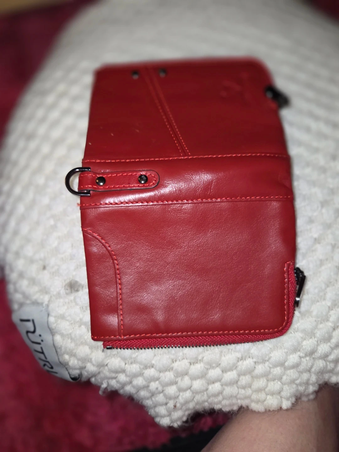 Selling a Humerpaul wallet in red leather. It's in great condition and has lots of space for cards and cash! The wallet has a zippered closure.