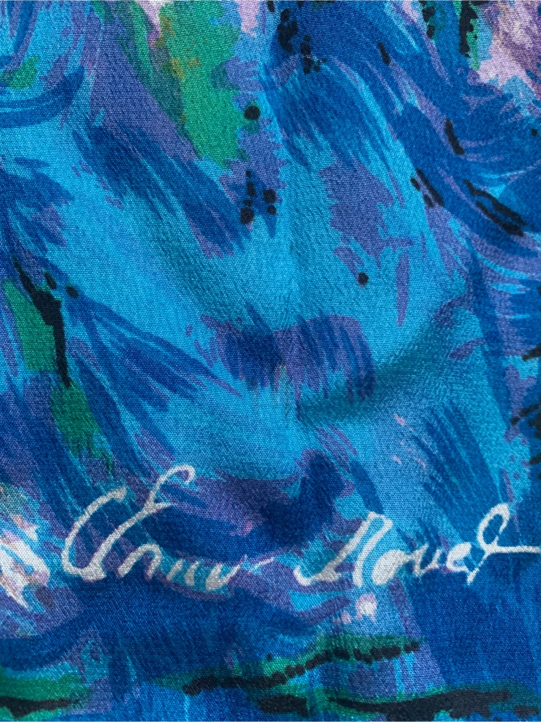 This is a beautiful Anne Klein scarf made of 100% silk. It has a vibrant, colourful pattern that would add a touch of elegance to any outfit!