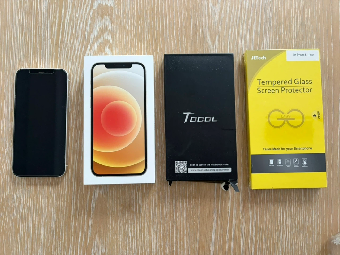 Selling an iPhone 12 in white with 64GB of storage. It comes with the original box. Also included are five screen protectors, designed for the iPhone 6.1-inch
