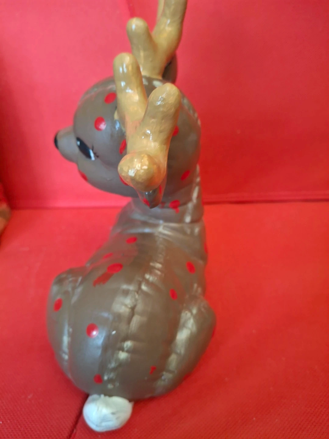 This is a cute vintage ceramic deer figurine. It has a brown colour with red polka dots and gold antlers. It would be a great addition to your home decor!