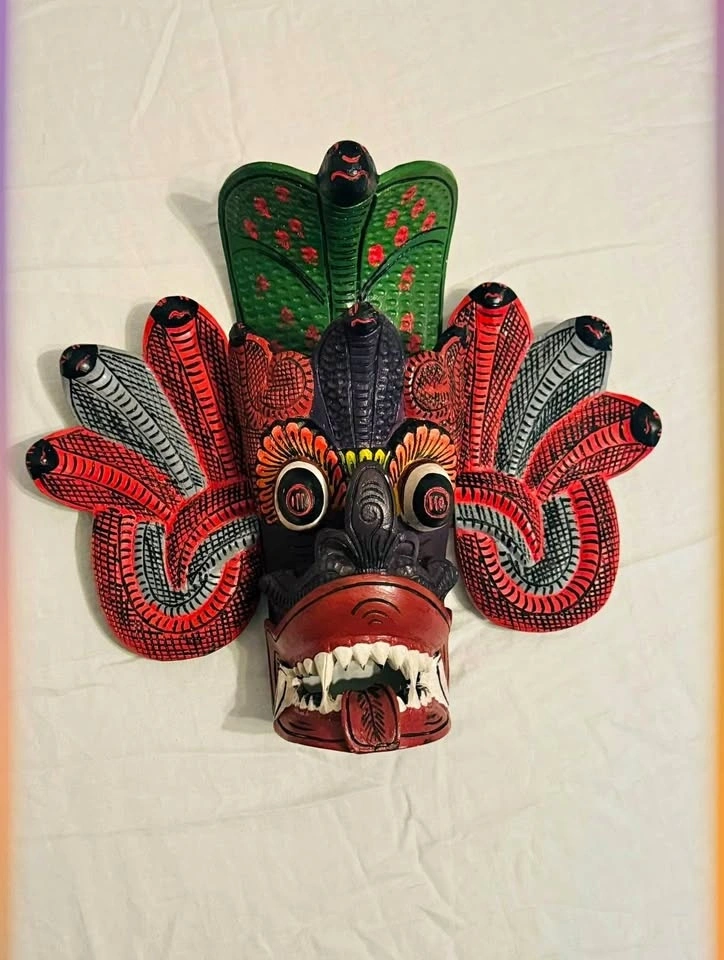 A beautifully carved and hand-painted wooden mask from Sri Lanka, rich in cultural heritage and vibrant detail. Perfect for wall decor, collectors, or as a unique statement piece. Adds character, color, and tradition to any space!
