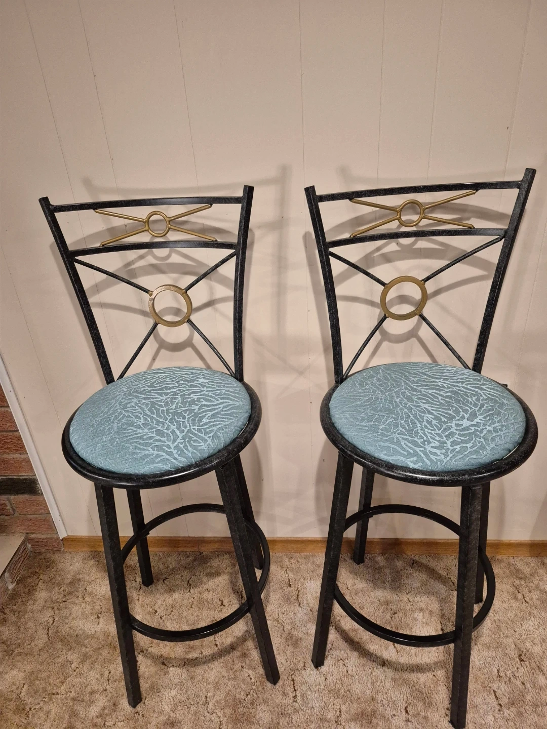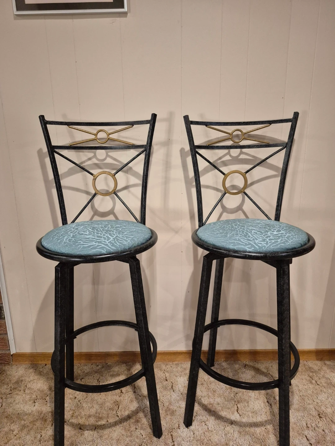 Selling a set of two bar stools with a metal frame and a teal patterned seat. They're in great condition and would look great in any kitchen or bar area!