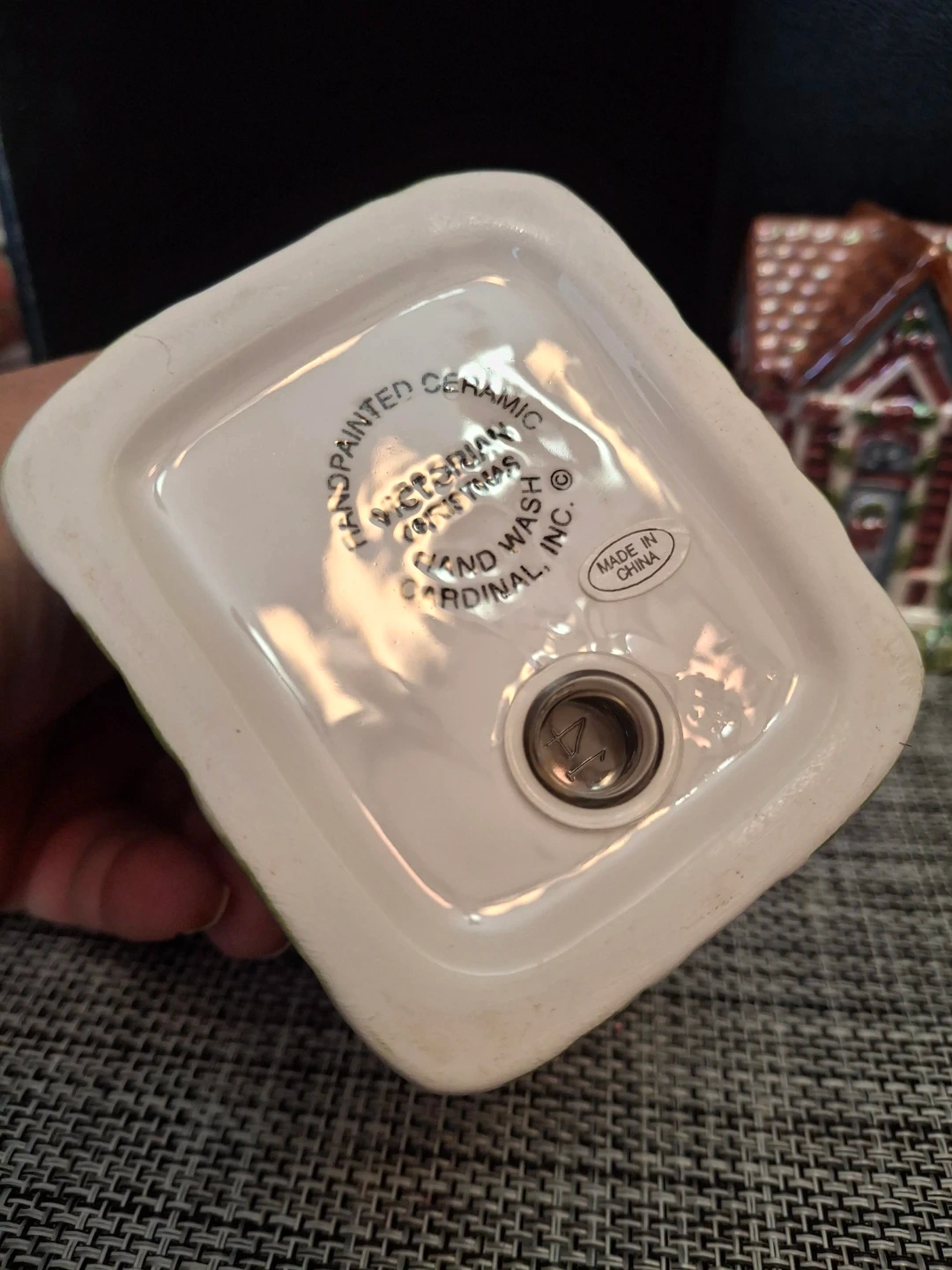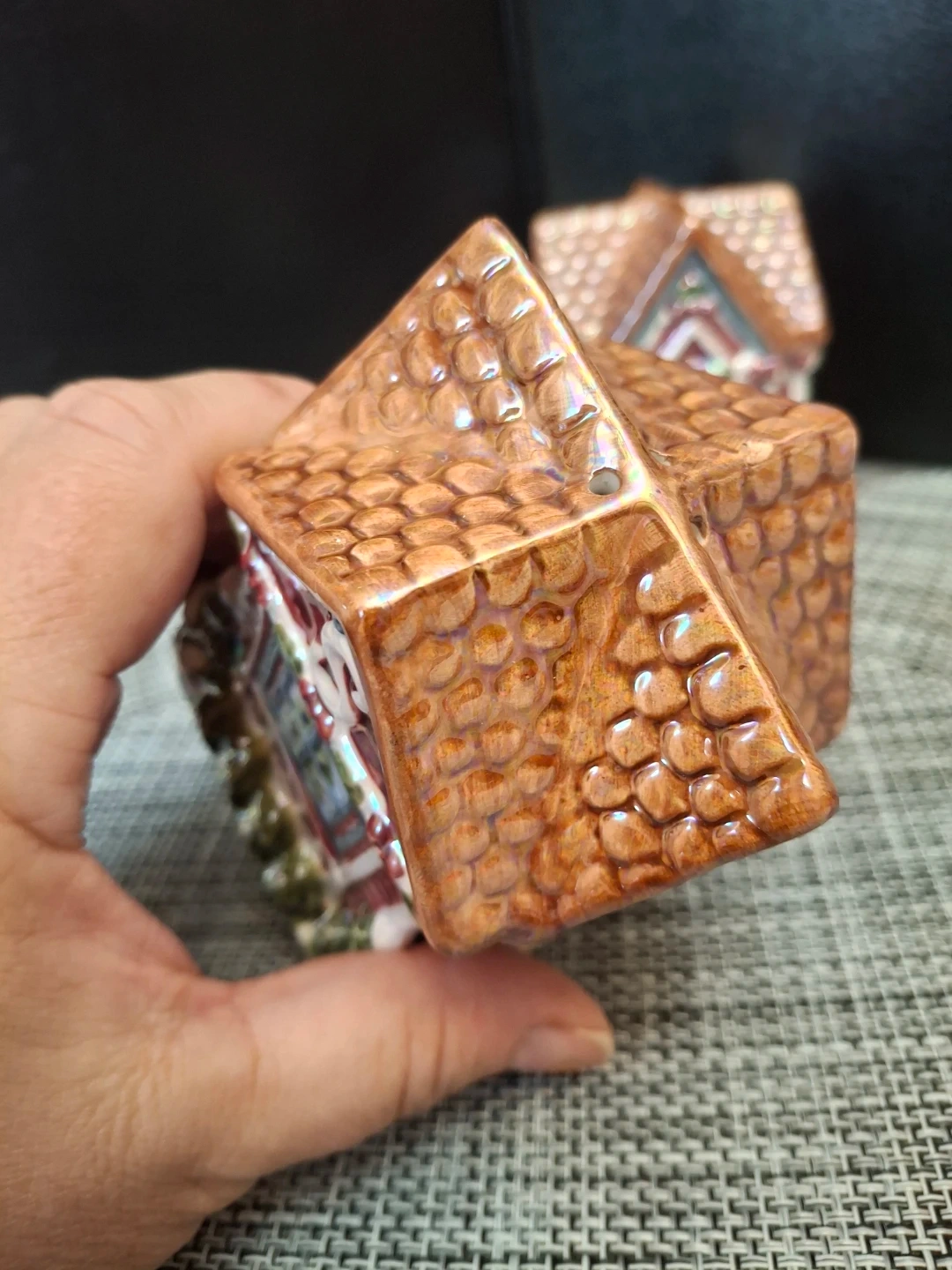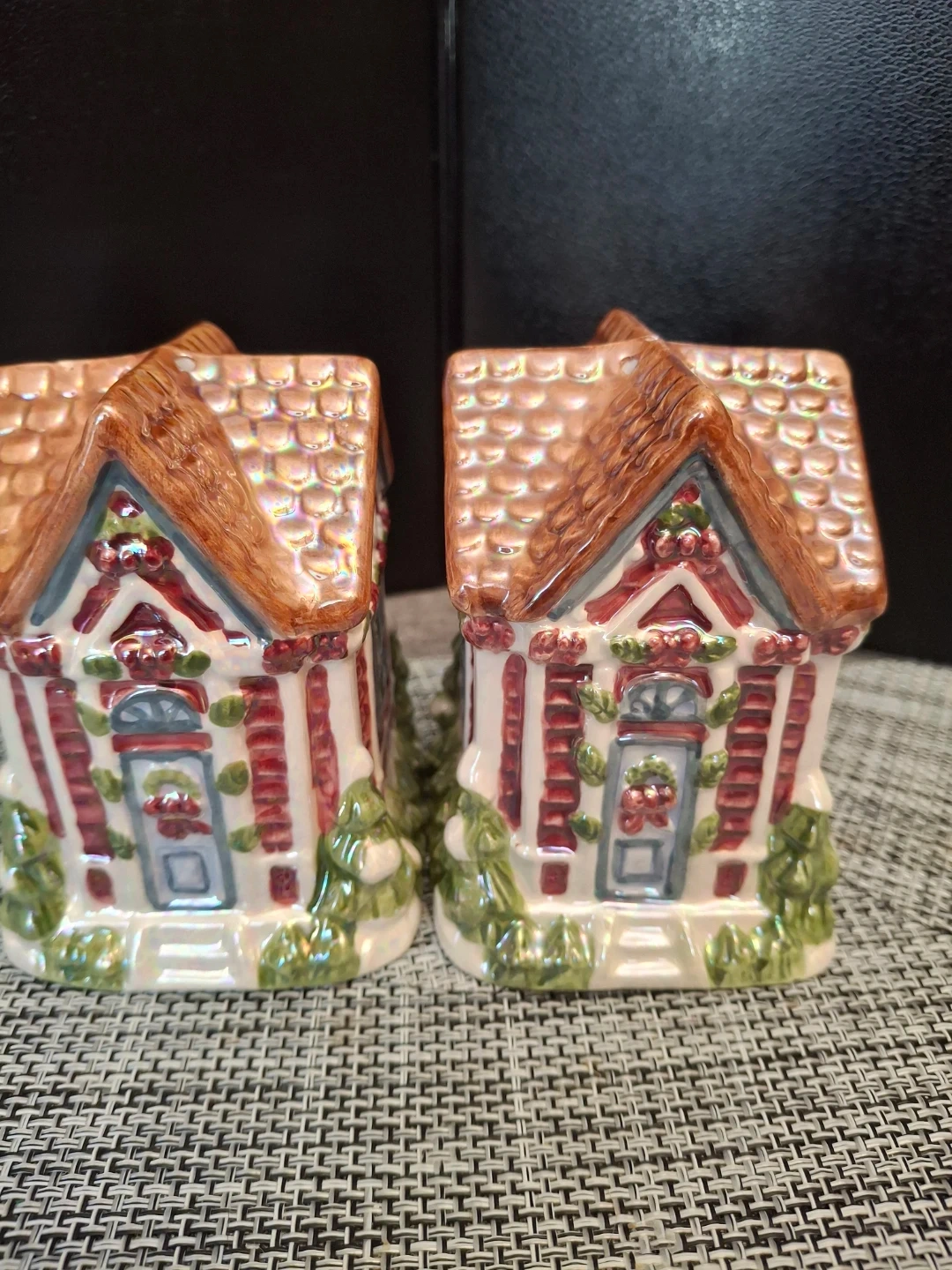 These are two cute ceramic house Salt and Pepper Shakers, They have a charming, detailed design with a brown roof and festive decorations