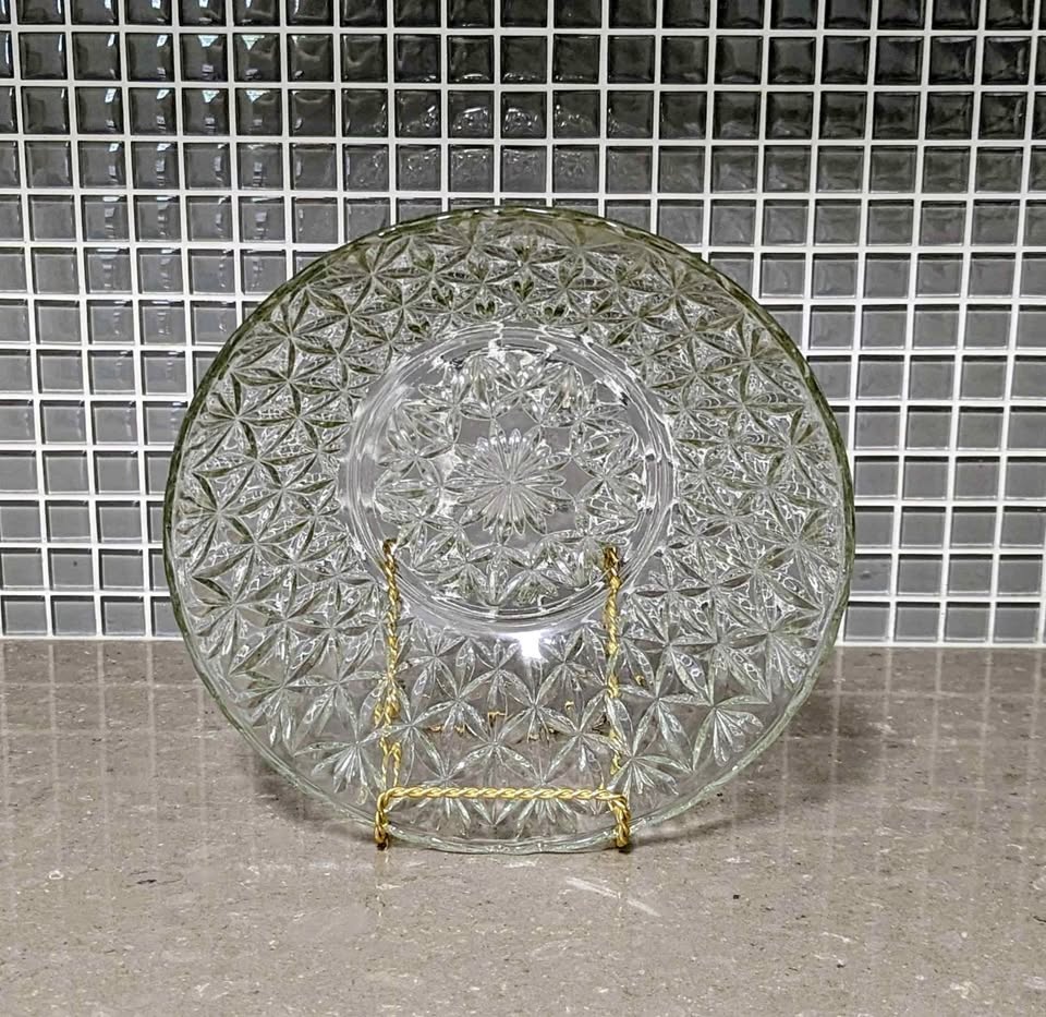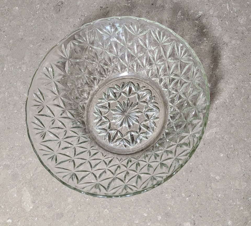 Beautiful vintage clear pressed glass serving plate, also known as a sandwich plate or bowl, made by Anchor Hocking. This piece features the distinctive "Arlington" or Line 4570 geometric starburst pattern. It is a lovely depression-era style piece, likely from the 1950s giftware line. Perfect for serving appetizers, desserts, or as a decorative piece. Brand: Anchor Hocking Pattern: Arlington (Line 4570) Color: Clear Material: Glass Approx. Diameter: 10 inches in diameter, 3 inches tall Condition Notes: No chips or cracks observed. Minor signs of wear consistent with age may be present.