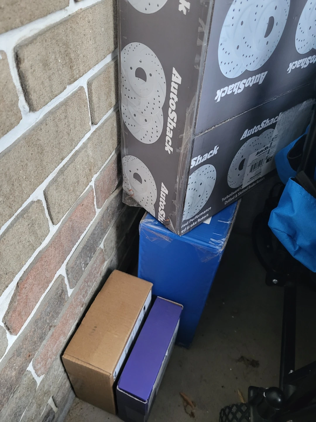 Selling a set of AutoShack brake rotors and ceramic brake pad kit. Includes both driver and passenger side components. The box indicates the weight is 2.6 lb and dimensions are 7.7 x 6.5. Perfect for your next brake job!