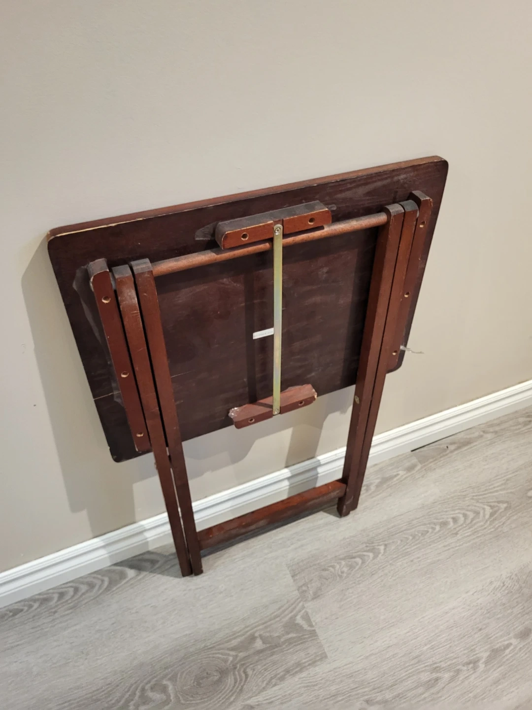 Here's a handy folding wooden TV tray table! It's perfect for snacks, meals, or working on your laptop while relaxing. It's in good used condition and folds up easily for storage when not in use.