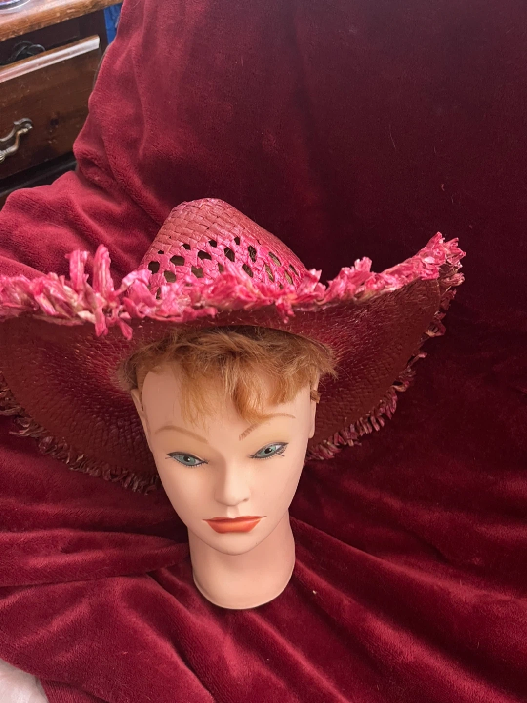 Selling a cute pink straw hat! It features a decorative rose detail and a fringed brim. Perfect for adding a touch of flair to your outfit