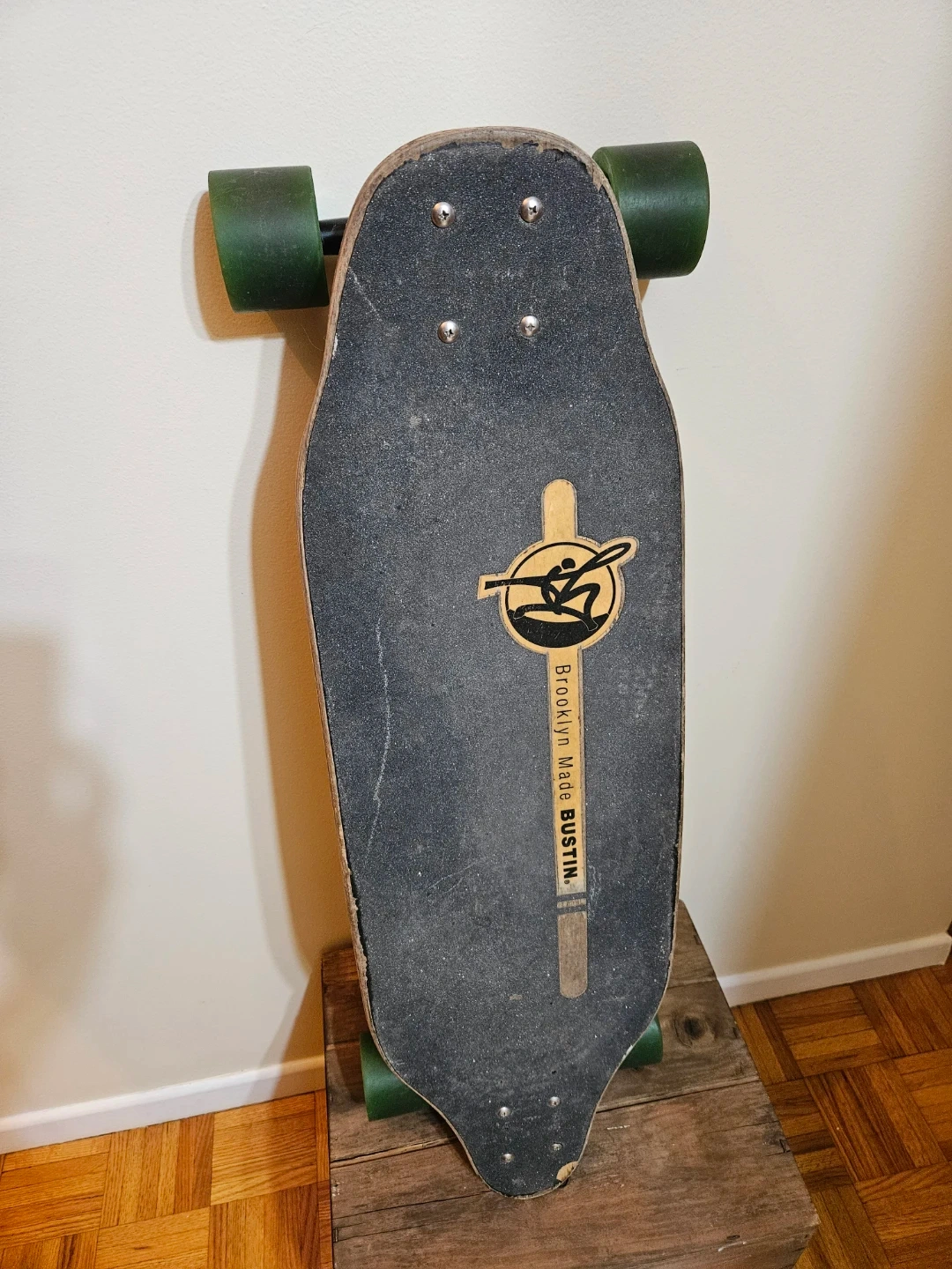 Selling a Bustin longboard skateboard. It features a cool Statue of Liberty design on the deck and green wheels. It's in used condition, but still rides well!