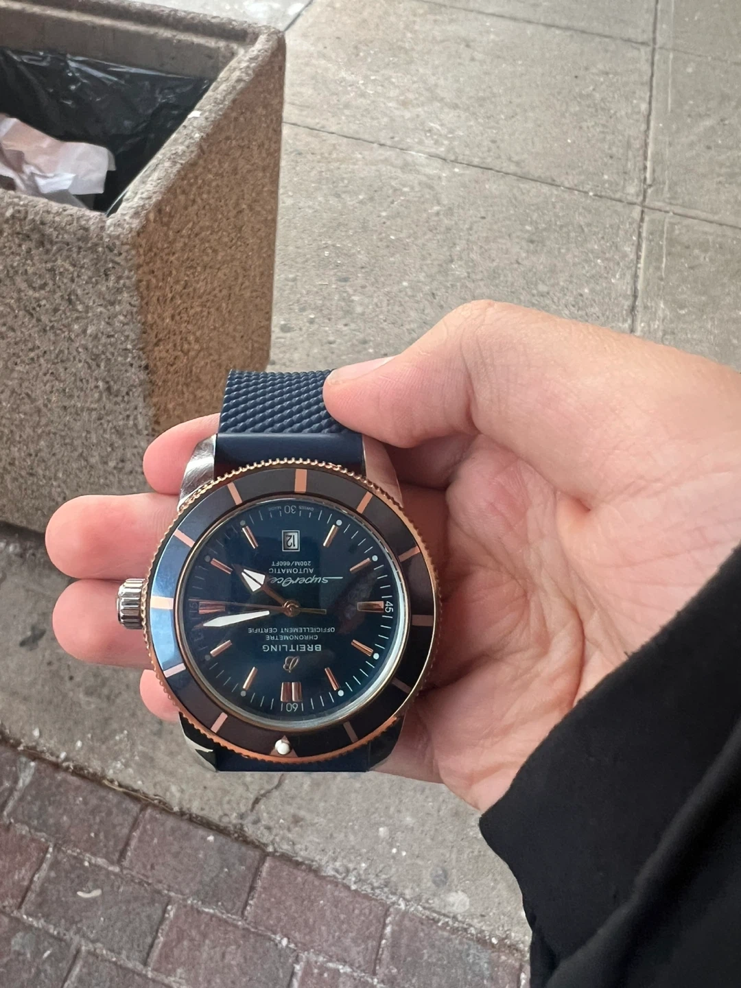 Selling a Breitling Superocean Automatic watch. It's in great condition and ready for a new wrist! This automatic watch is 46mm in size and features a blue dial with a blue rubber strap.