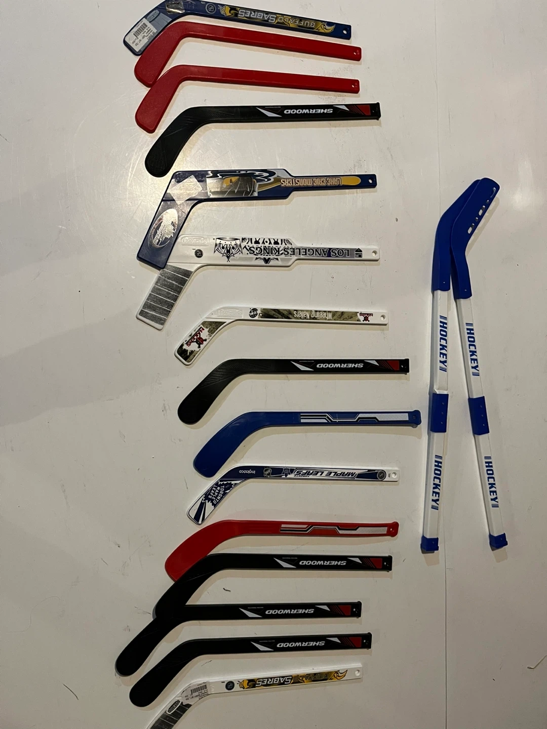 Selling a collection of mini hockey sticks! There are several teams represented, including the Buffalo Sabres, Los Angeles Kings, Toronto Maple Leafs, and more. There are also a few Sherwood sticks in the mix. Great for collecting or for kids!