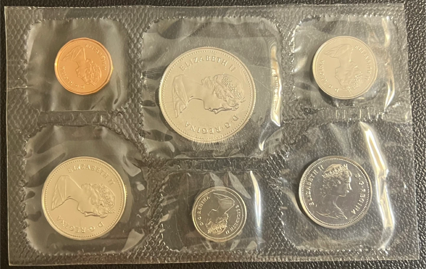 Selling a 1985 uncirculated Canadian coin set still in its original packaging. It includes a penny, nickel, dime, quarter, dollar, and half-dollar. A great addition to any collection!