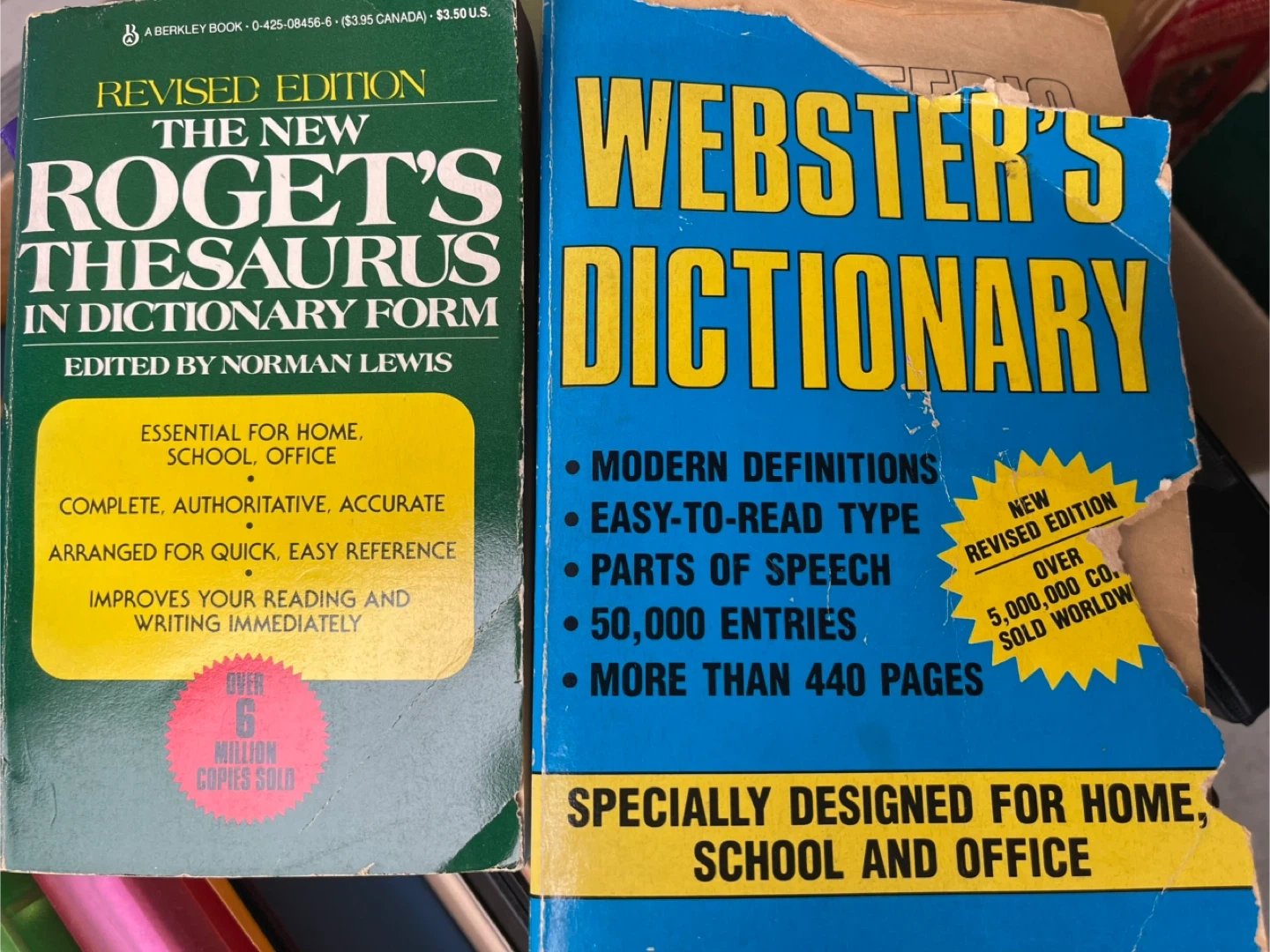 Selling a revised edition of Roget's Thesaurus in dictionary form, edited by Norman Lewis. It's essential for home, school, and office use, complete, authoritative, and accurate. It's arranged for quick, easy reference and improves your reading and writing immediately. Over 6 million copies have been sold! Also included is Webster's Dictionary with modern definitions, easy-to-read type, parts of speech, 50,000 entries, and over 440 pages. It's specially designed for home, school, and office use