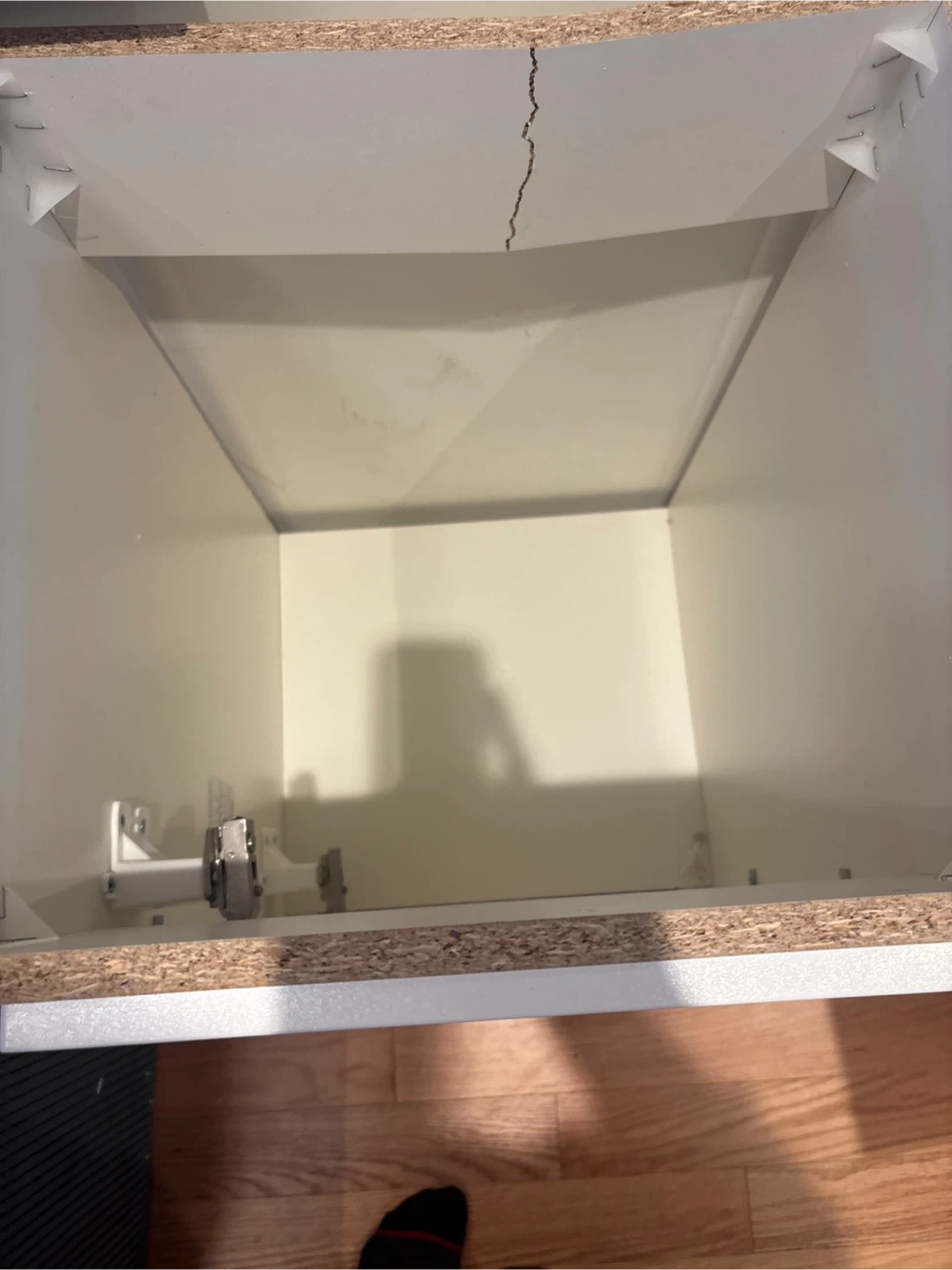Selling a white bathroom vanity cabinet. It's in good condition and perfect for adding storage to your bathroom! There is some slight damage to the back of the cabinet.