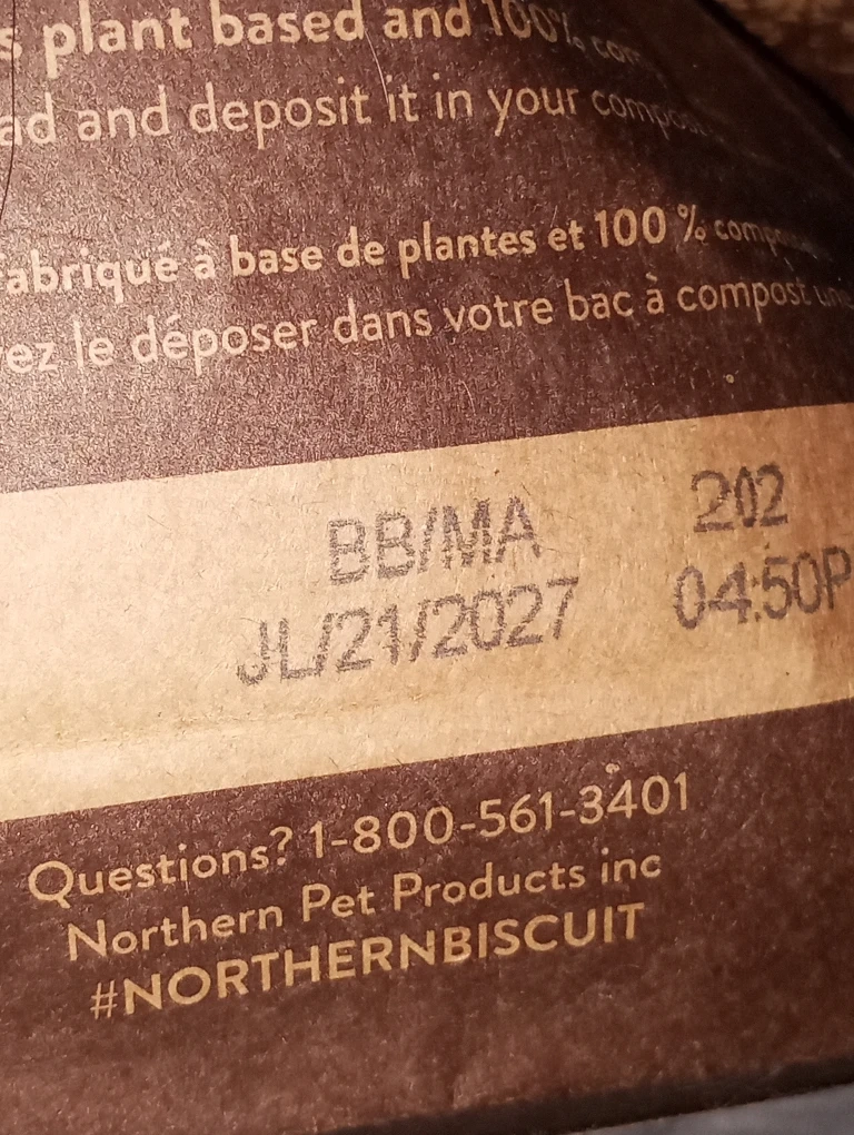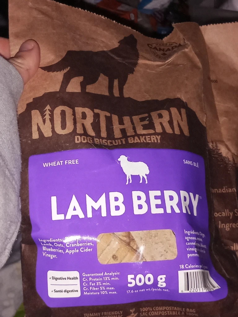 Selling a bag of Northern Dog Biscuit Bakery Lamb Berry flavour biscuits! They're wheat-free open bag. Ingredients include flax, oats, cranberries, blueberries, and apple cider vinegar. The best before date is July 21, 2027