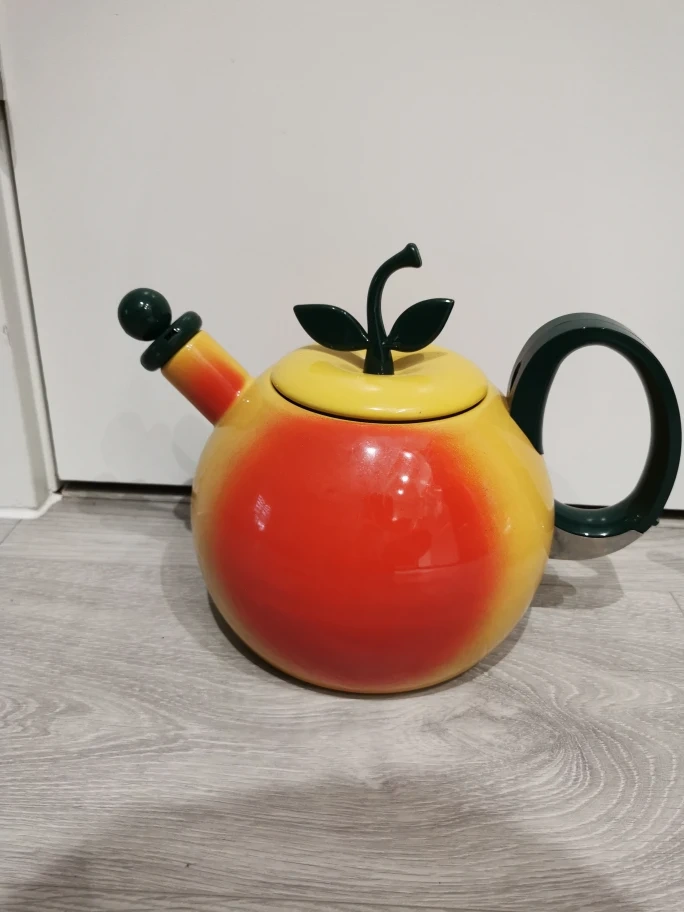 Here's a fun apple-shaped teapot! It's in great condition and ready to brew your favourite tea. The colours are vibrant, with a mix of red, yellow, and green. Perfect for adding a touch of whimsy to your kitchen or tea party