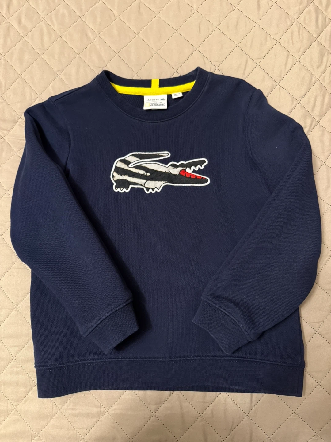 Selling a Lacoste x National Geographic kids sweatshirt. It's a navy blue colour with a unique crocodile design. Perfect for a young explorer!