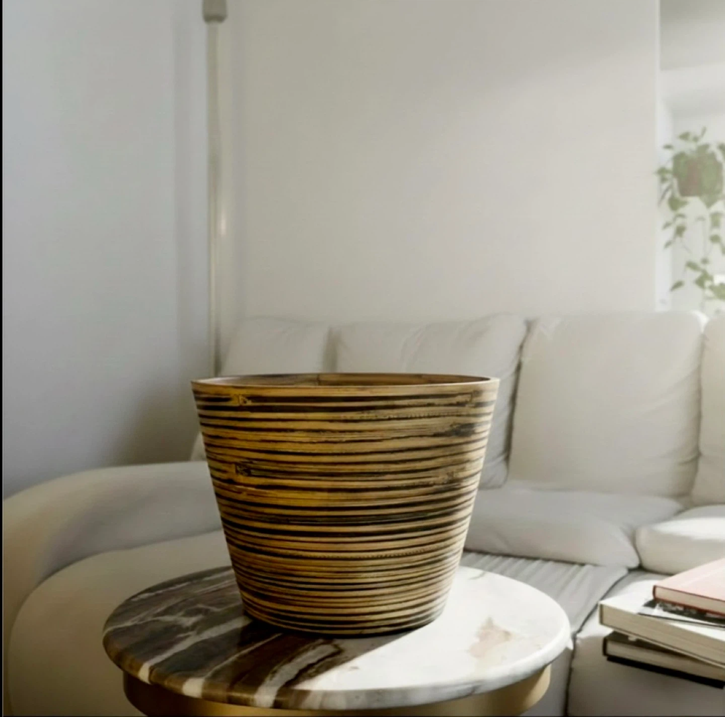 Selling a 12in/30cm black bamboo planter. This planter has a volume capacity of 3.06 gal (11.57L). It's in great condition and ready to add some style to your plants!