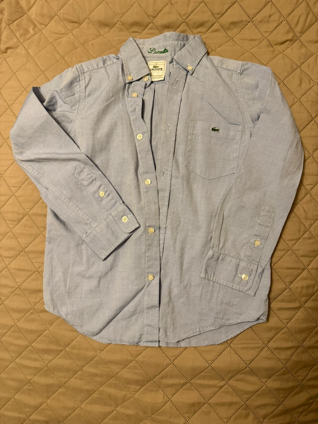 Here's a classic light blue button-down shirt from Lacoste! It's in great condition, practically new, and features the iconic Lacoste logo on the chest pocket.