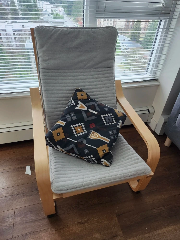 Selling a comfy IKEA Poang chair! It's in great condition. The cushion is a neutral grey colour and the frame is a light wood tone. Great for relaxing after a long day! The black cushion is not included.