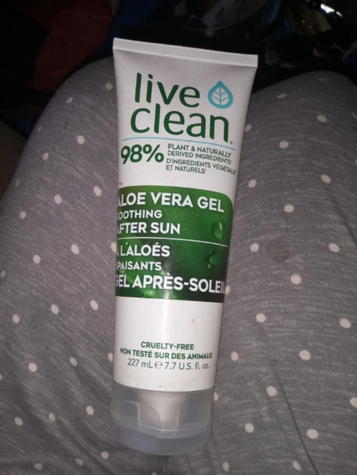 I'm selling a tube of Live Clean Aloe Vera Gel. It's perfect for soothing skin after sun exposure. The tube contains 227 mL (7.7 U.S. fl. oz.) of cruelty-free gel that is 98% plant and naturally derived ingredients