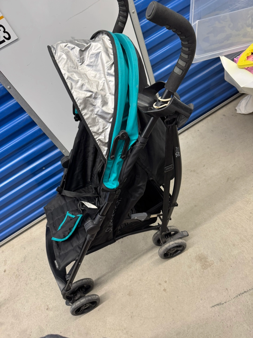 Selling a Summer Infant 3Dlite Convenience Stroller in black with turquoise accents! This stroller is lightweight and easy to fold, making it perfect for travel or everyday use. It has a durable frame and a comfortable seat for your little one. It is in good condition and ready for its next adventure!
