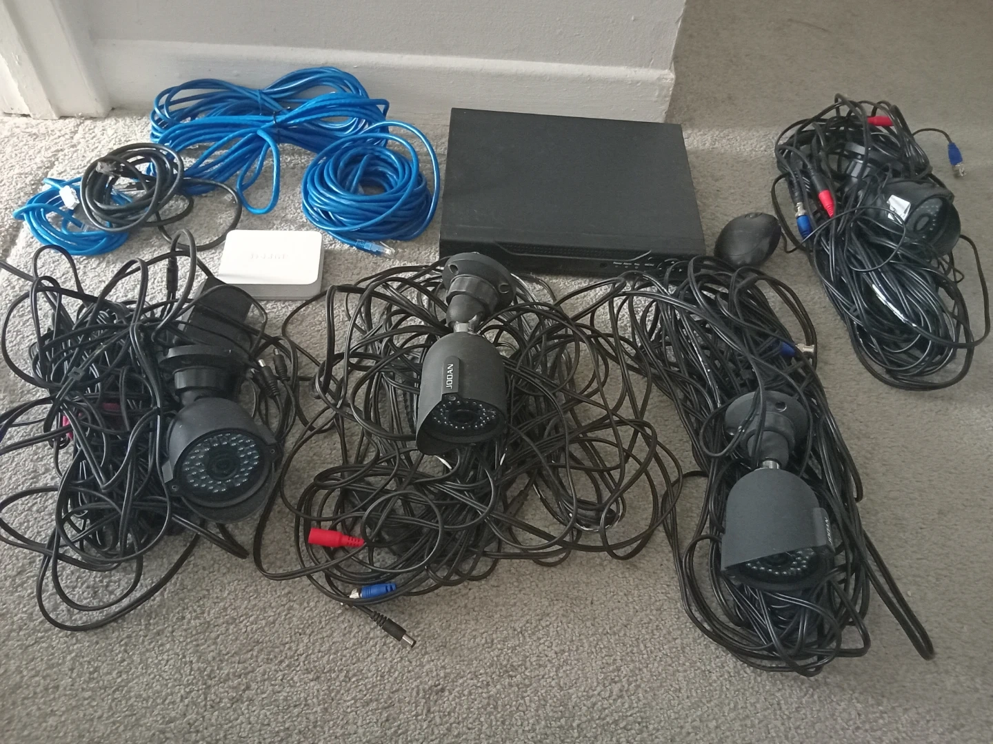 Selling a JODAN security camera system. Includes multiple cameras, blue cables, and a DVR unit. Great for home or business surveillance.