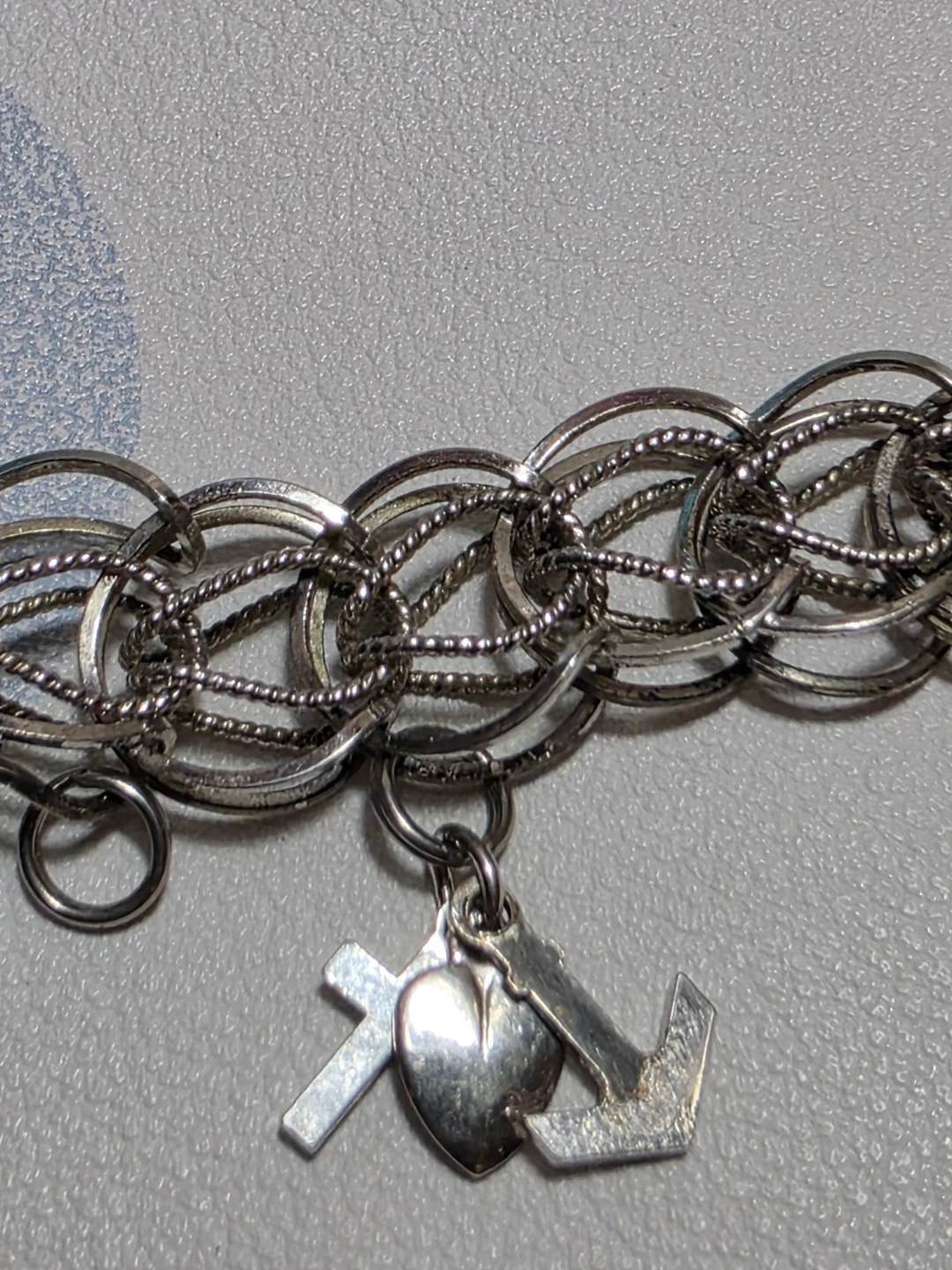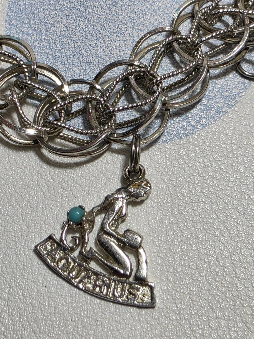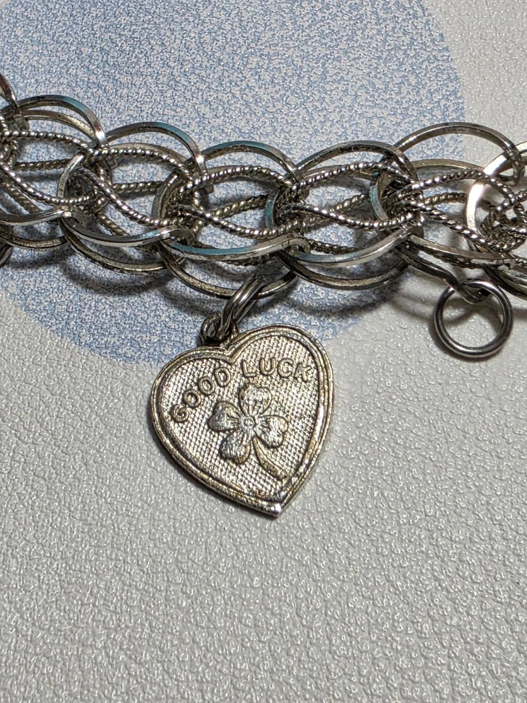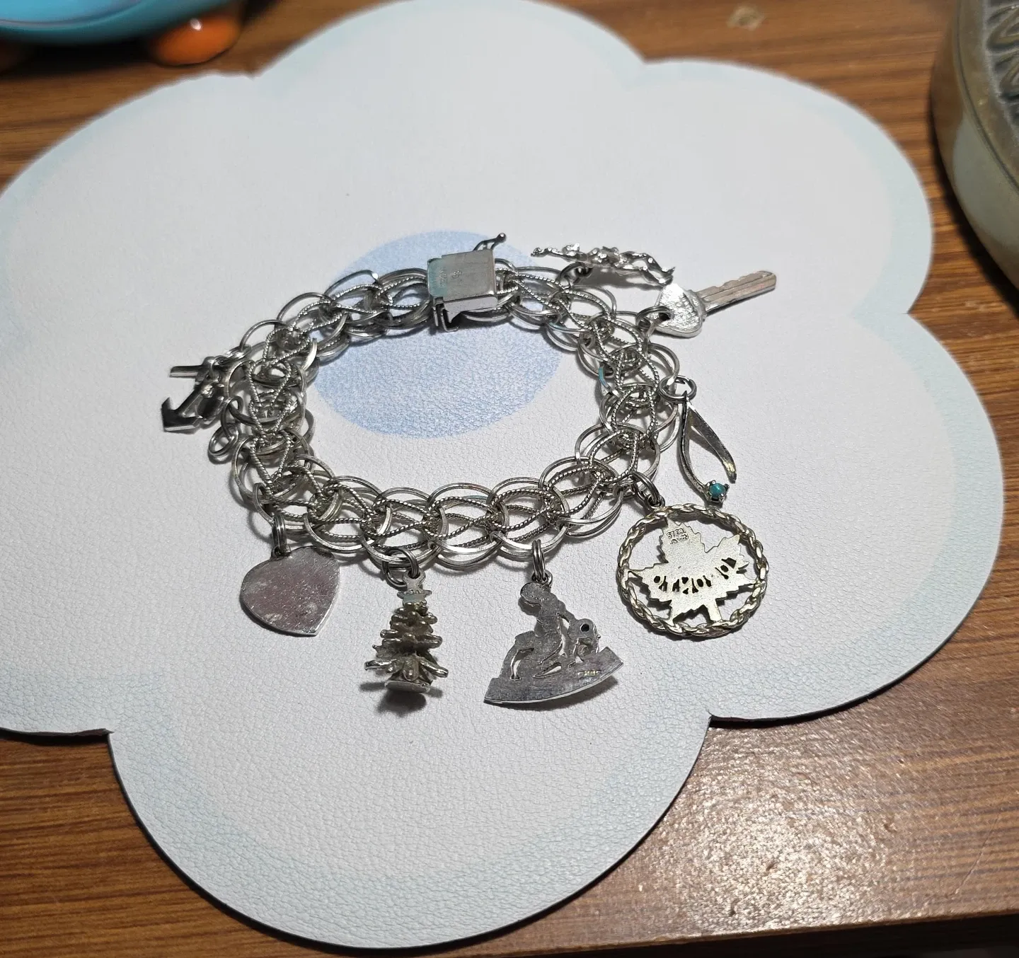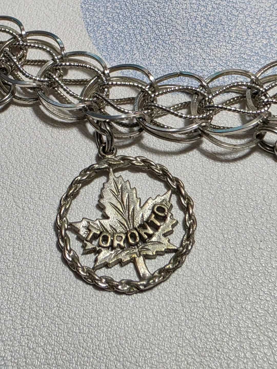 Charm bracelet with multiple charms including a Toronto maple leaf, a heart that says 'Good Luck', an Aquarius charm, and others.