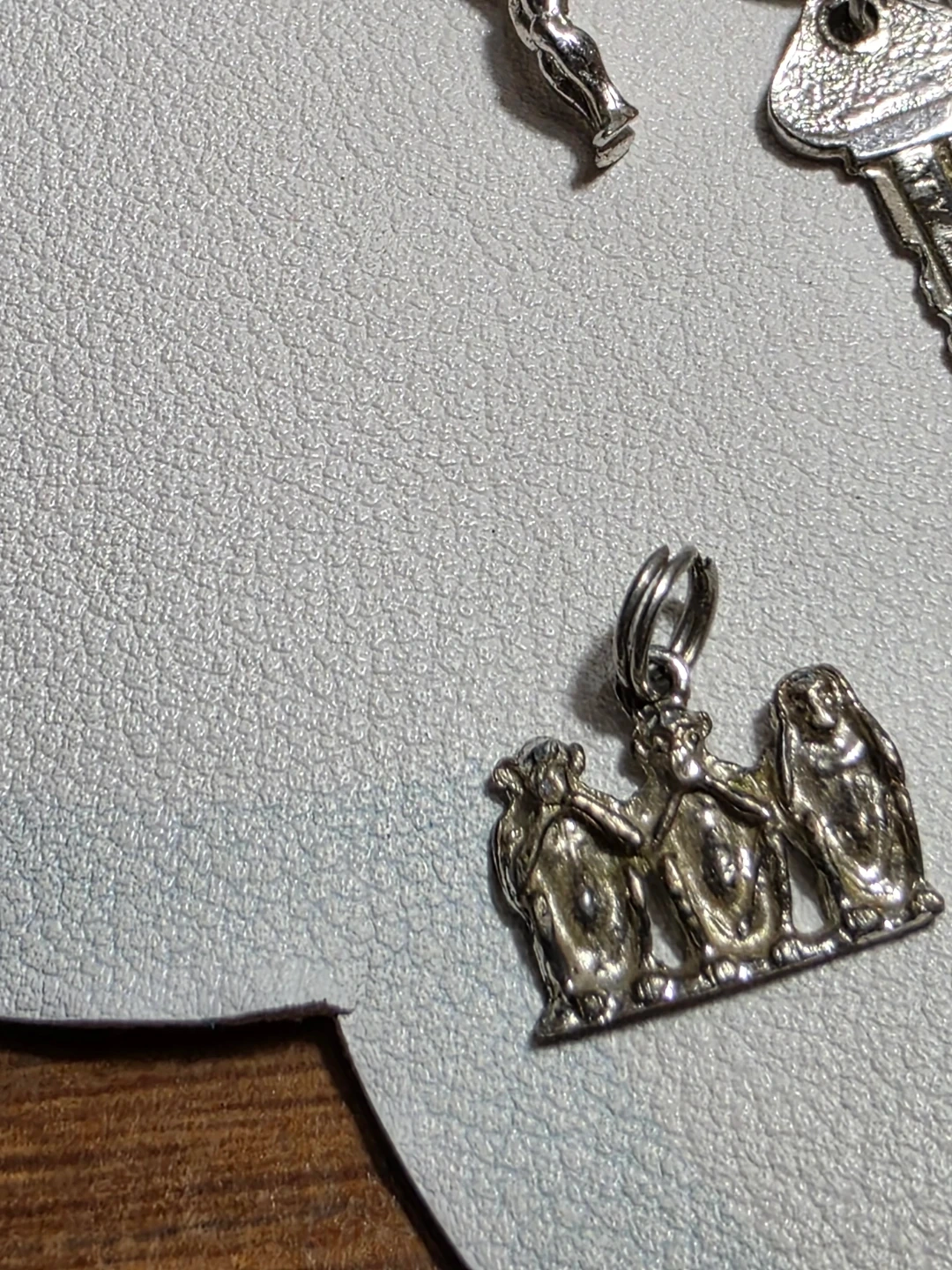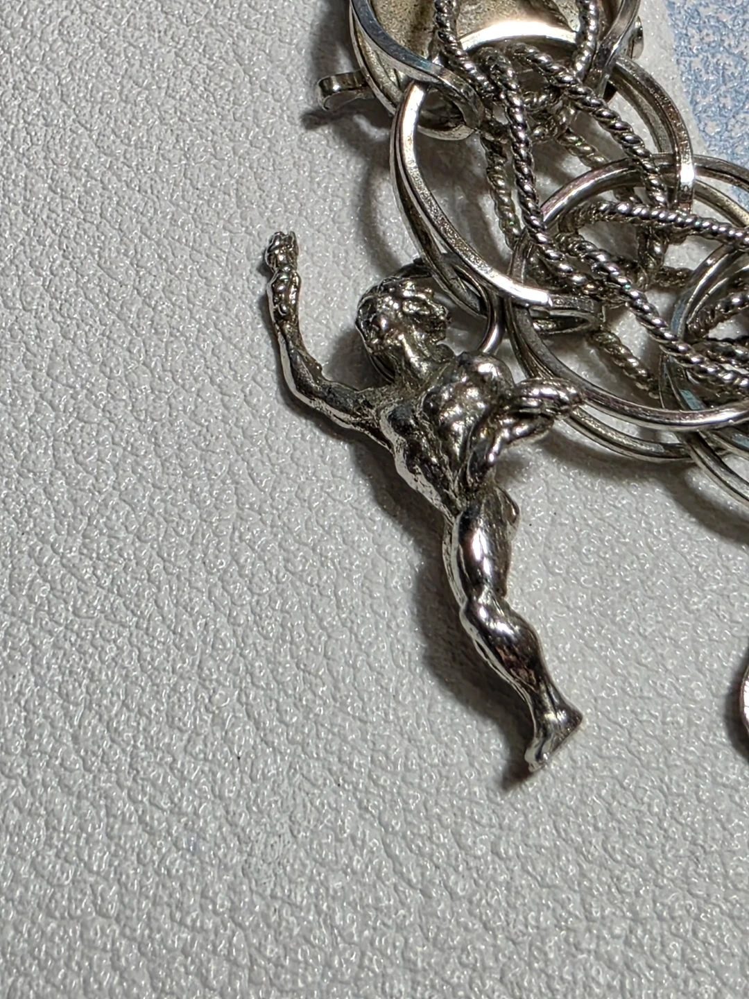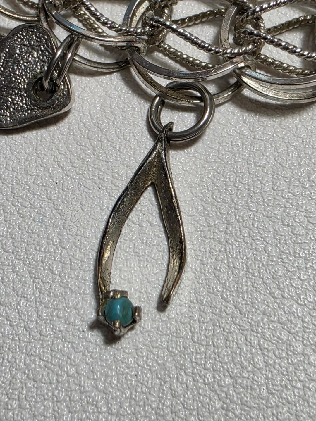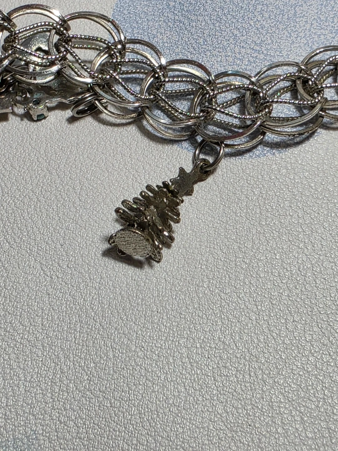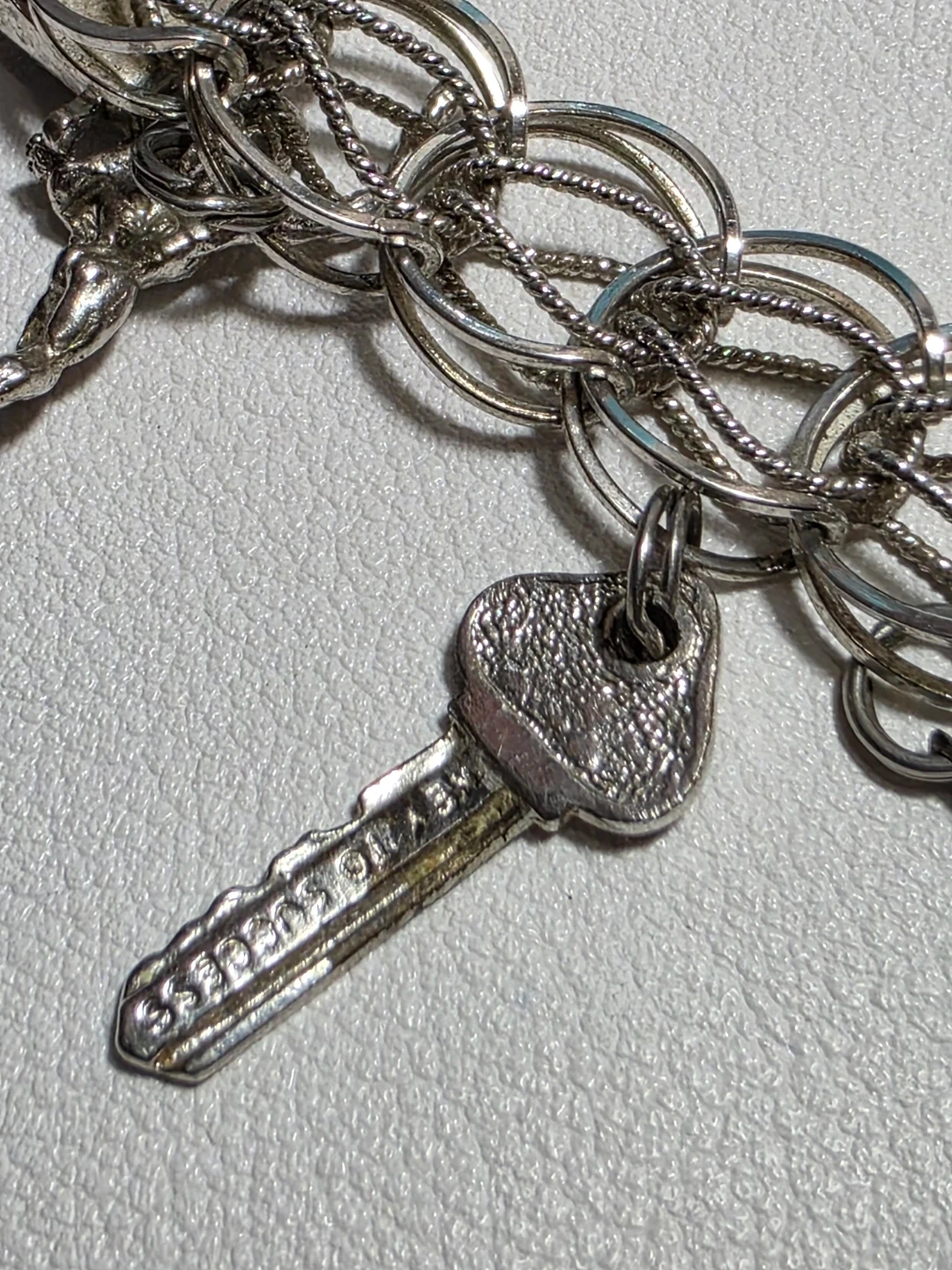 Charm bracelet with multiple charms including a Toronto maple leaf, a heart that says 'Good Luck', an Aquarius charm, and others.