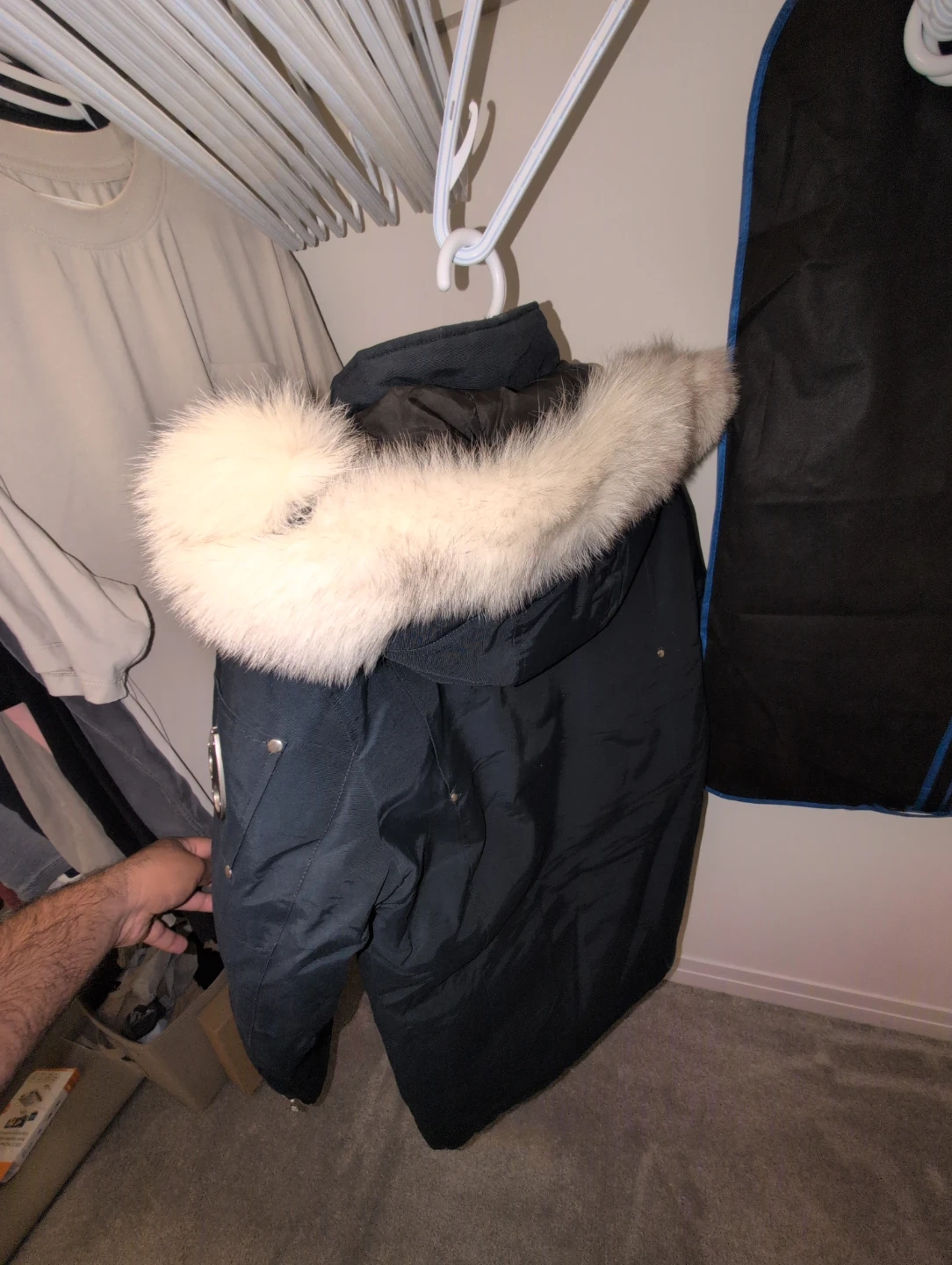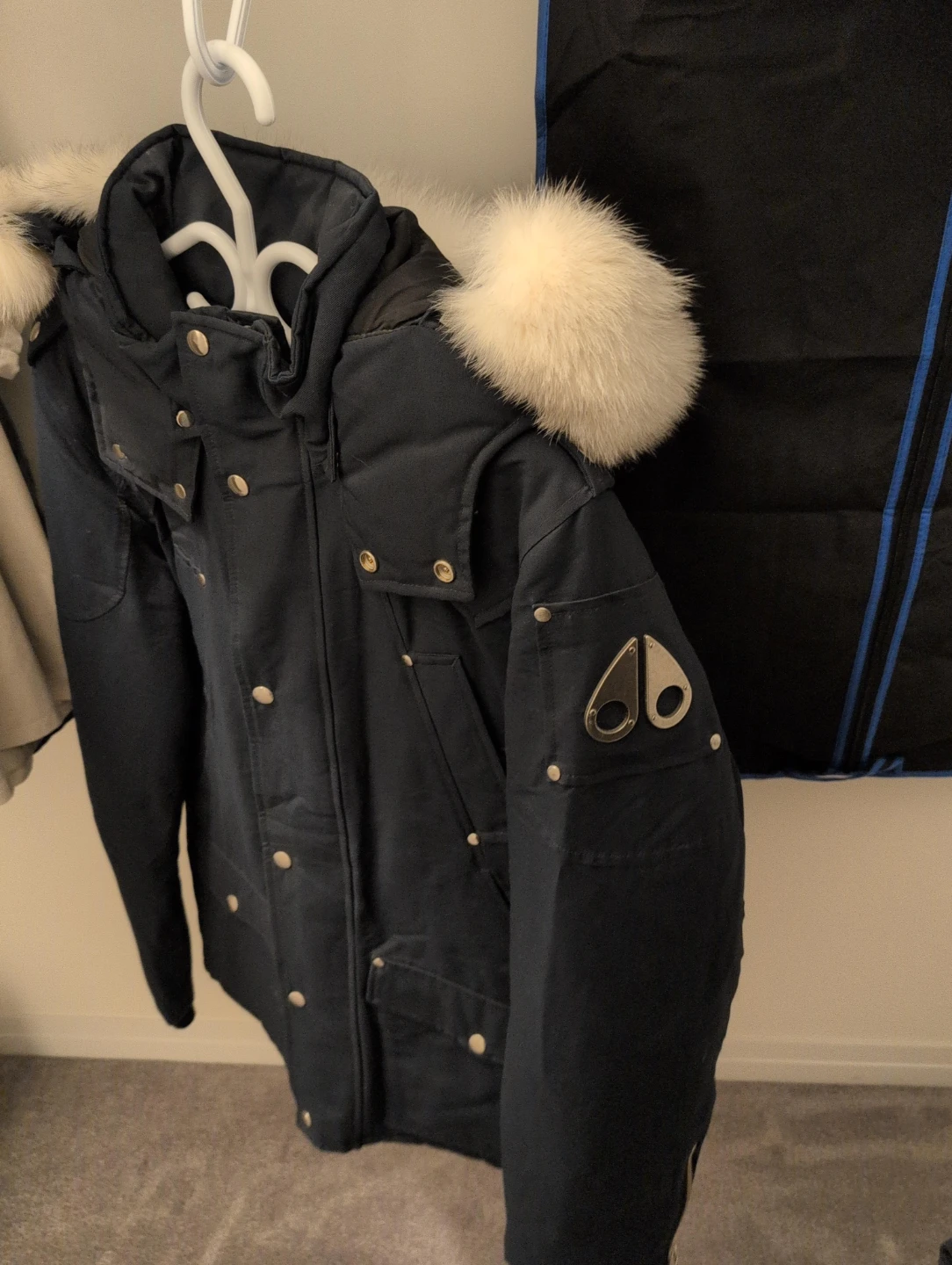 Selling a Moose Knuckles down-filled parka. It's in great condition and perfect for the Canadian winter! The jacket features the iconic Moose Knuckles logo on the sleeve and a fur-trimmed hood for extra warmth.