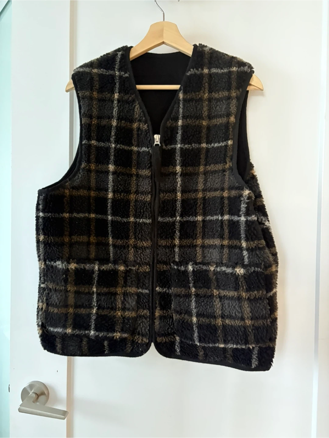 Cozy H&M fleece vest with a plaid pattern! It's a and features a full zip closure. Perfect for layering on those chilly days