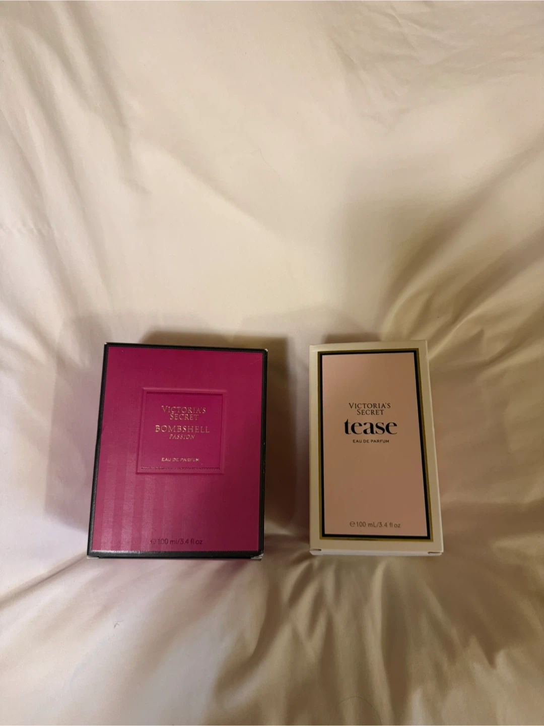 Selling Victoria's Secret perfumes. Both brand new bombshell passion and tease perfume, both in their original boxes. Both are eau de parfum and 3.4 oz (100 ml) each.