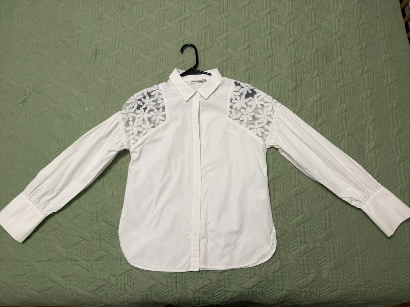 It features floral lace detailing on the sleeves, adding a touch of elegance to the classic design. It's in great condition and ready for a new home in your wardrobe. Great for office