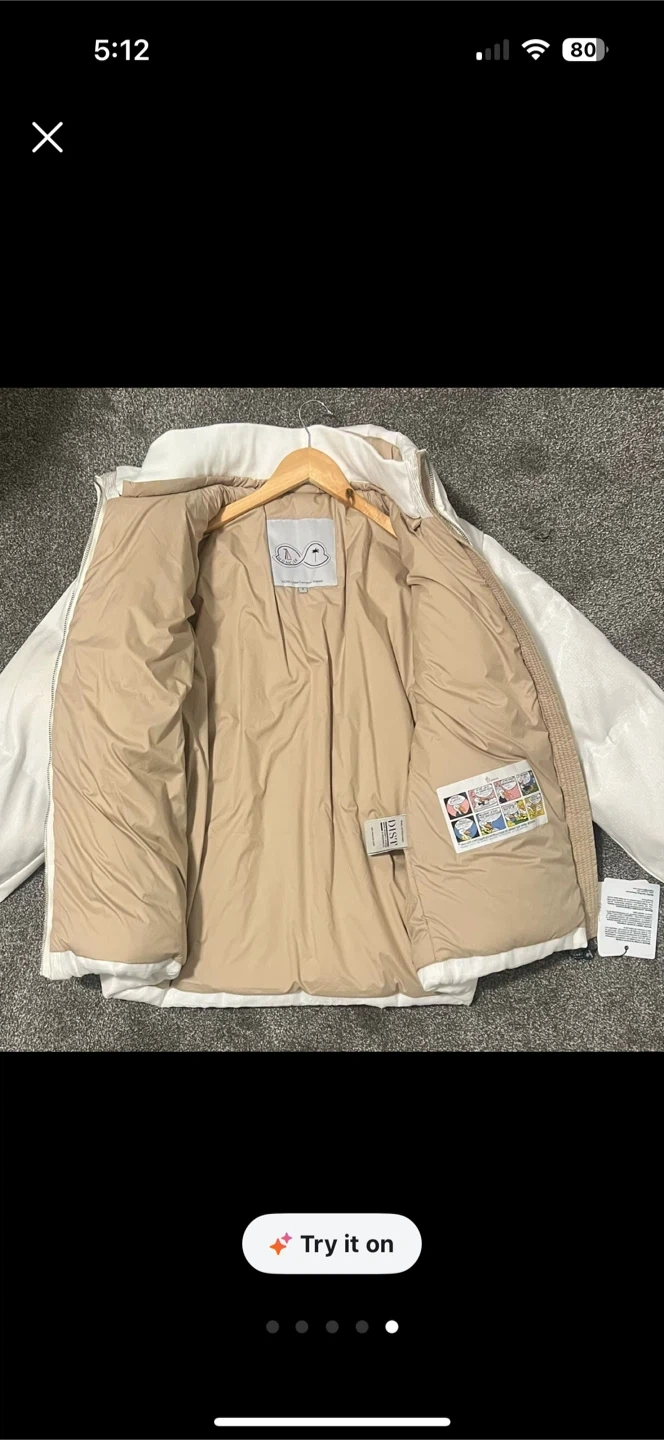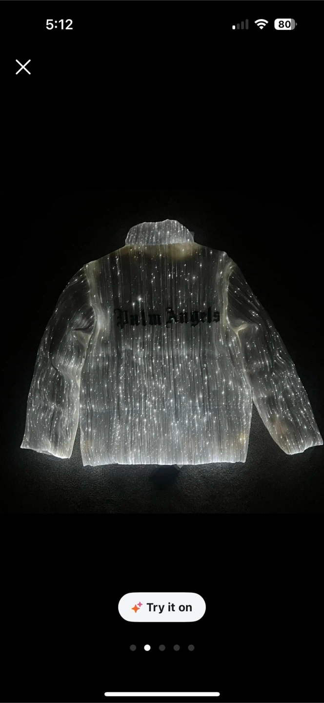 Selling a Palm Angels white padded jacket! It's in great condition and ready for a new owner. The jacket features the Palm Angels logo on the back.