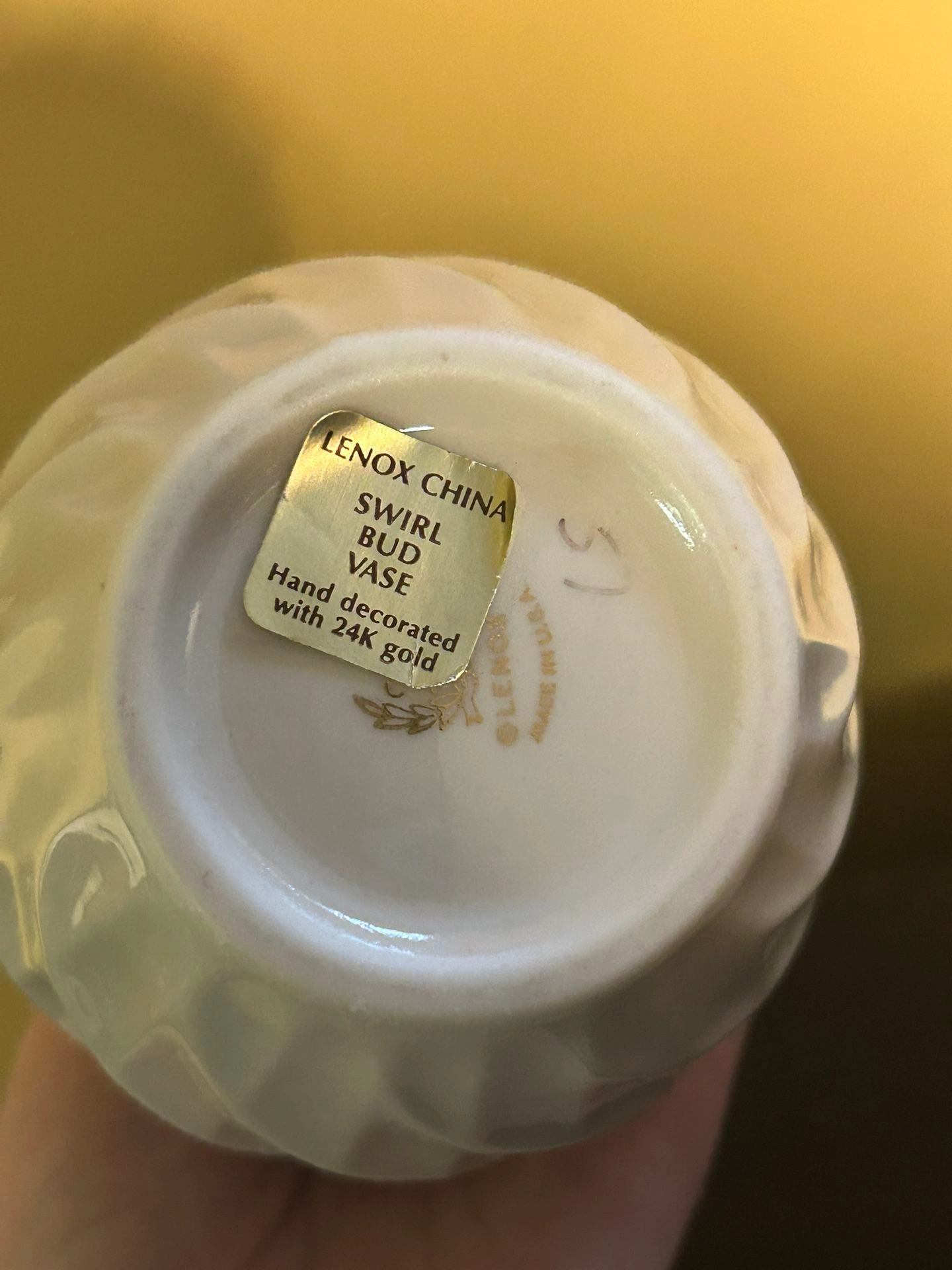 Buy & SellLenox China Swirl Bud Vase, 24k Gold AccentsLenox China Swirl Bud Vase, 24k Gold Accents$10Elegant Lenox China vase. Swirl design. 24k gold accents. Hand-decorated. Medium size, perfect for a bouquet or display.WHERE TO MEETCheck LocationView MapSELLERverifiedRebecca WOceanside650 reviews0 chats·0 favorites·0 views