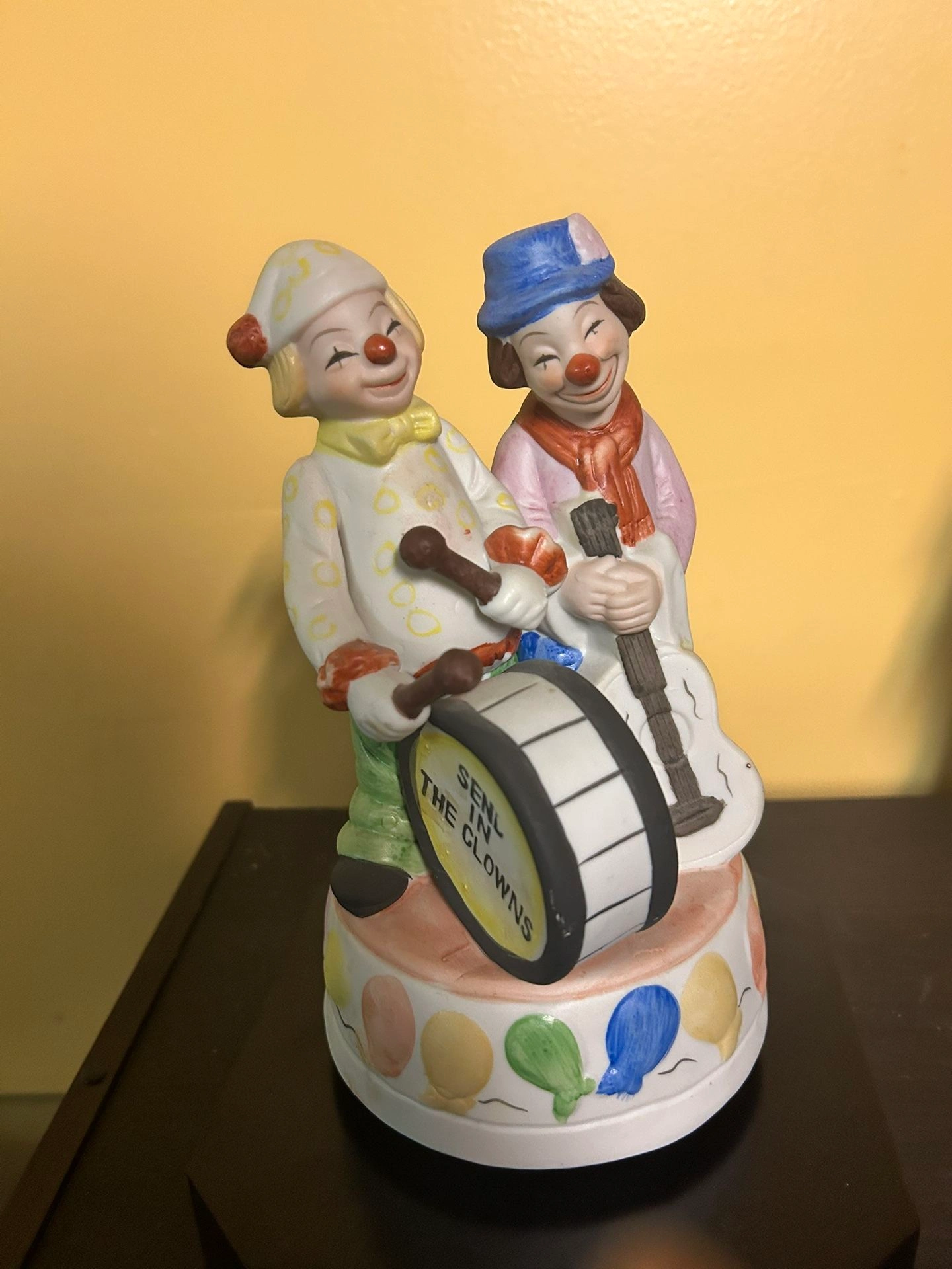 Adorable vintage porcelain music box. Features two clowns playing instruments. Base decorated with balloons. Plays a tune when wound. Collectible. Type: Clowns & Circuses