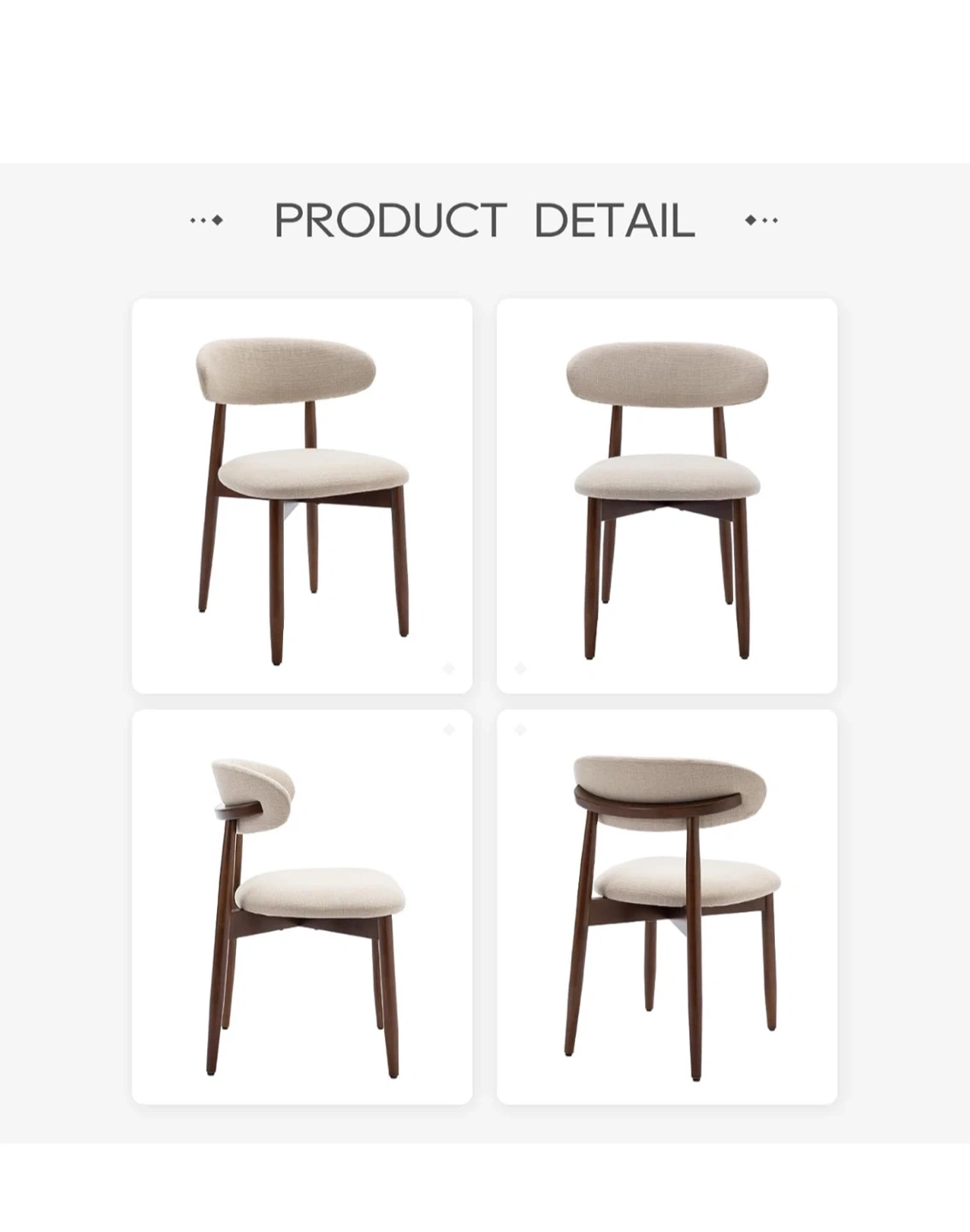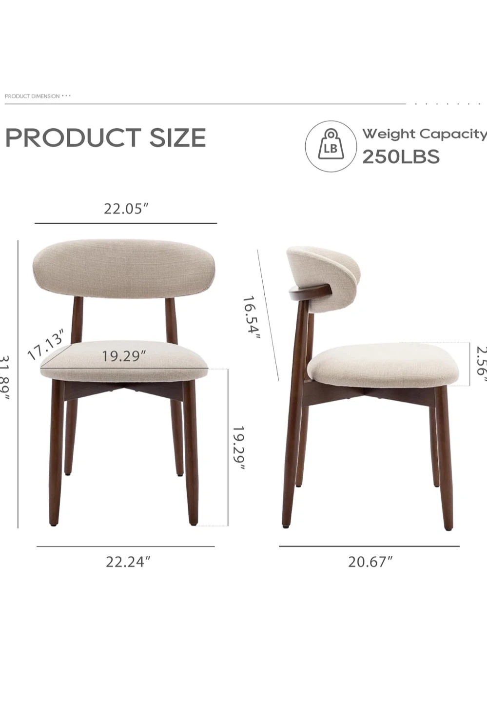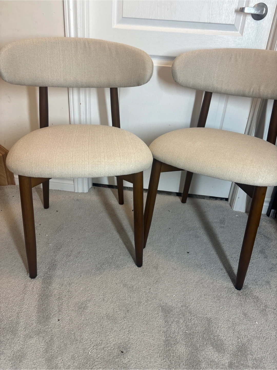 Selling a set of two dining chairs! They're a lovely beige colour with wooden legs. The chairs are 22.05" wide and 31.89" tall. Each chair can hold up to 250lbs