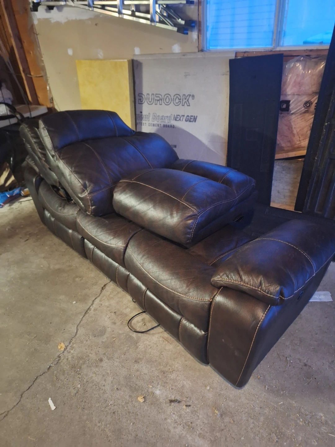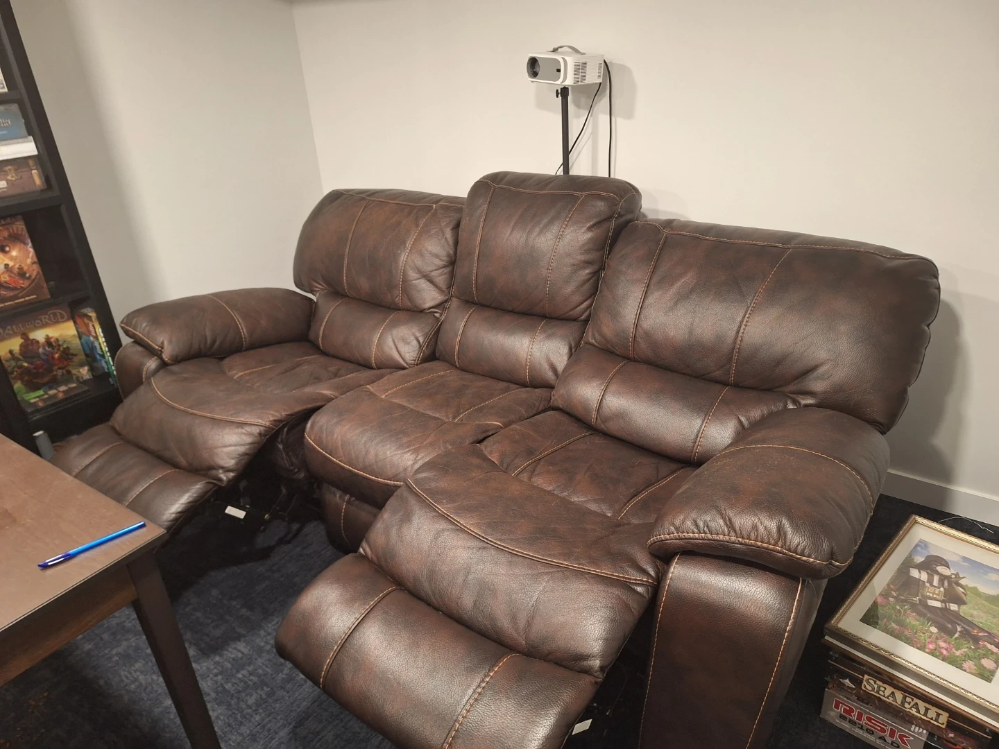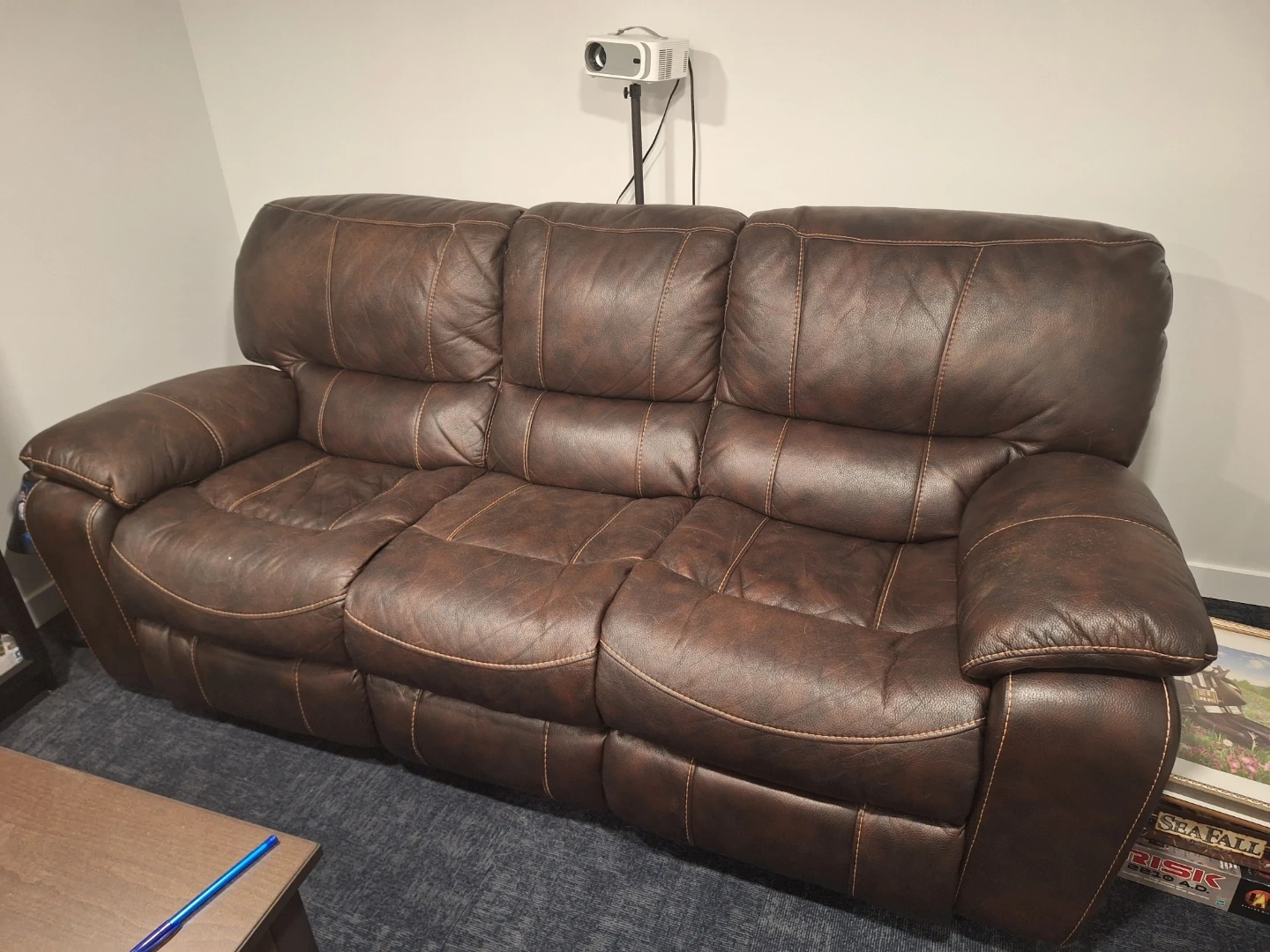 Comfortable brown leather reclining sofa. Perfect for your living room or entertainment space! It's in good condition and ready for a new home