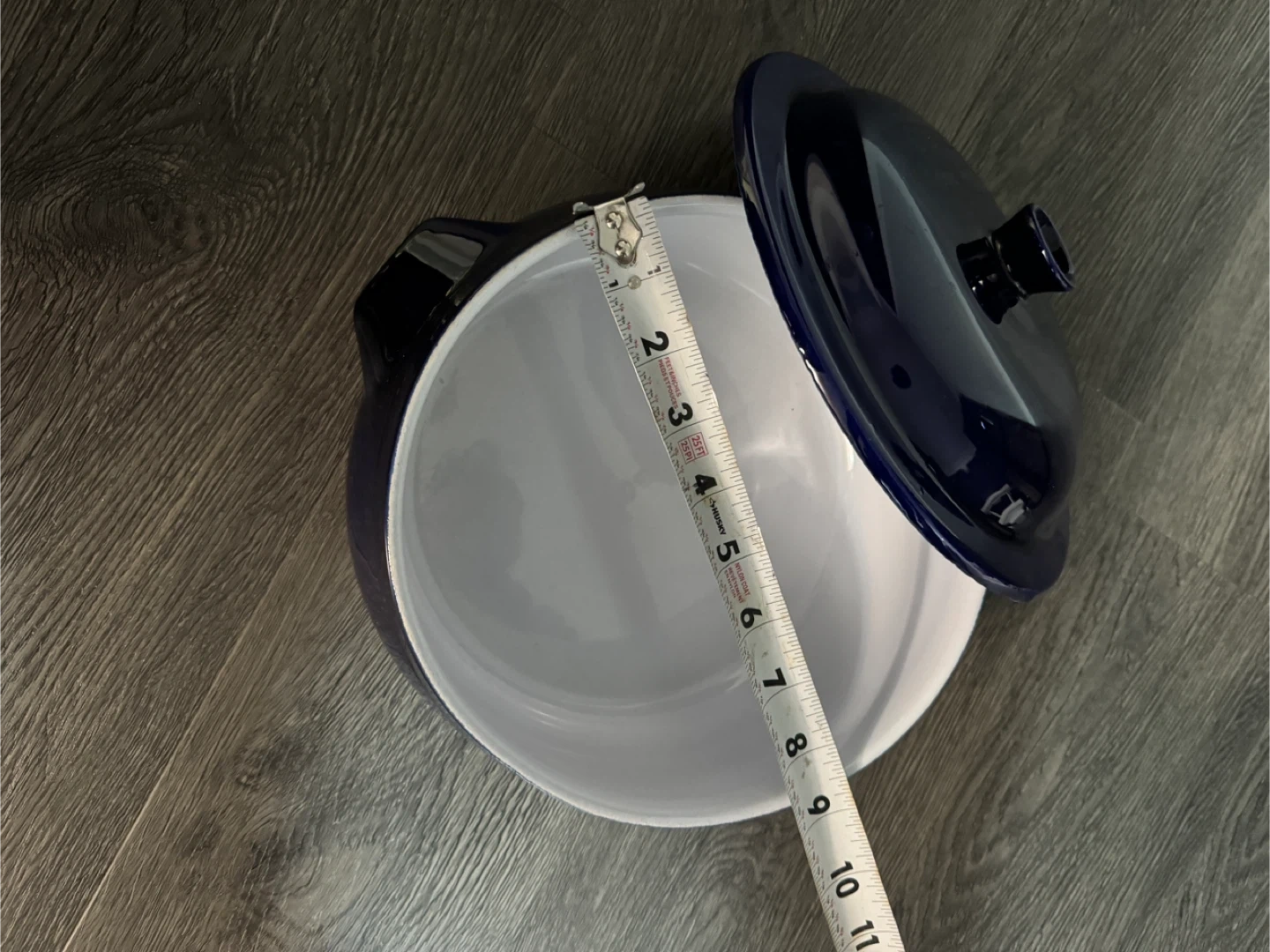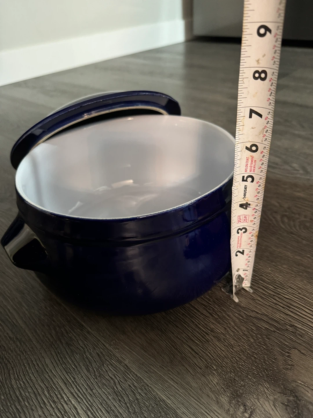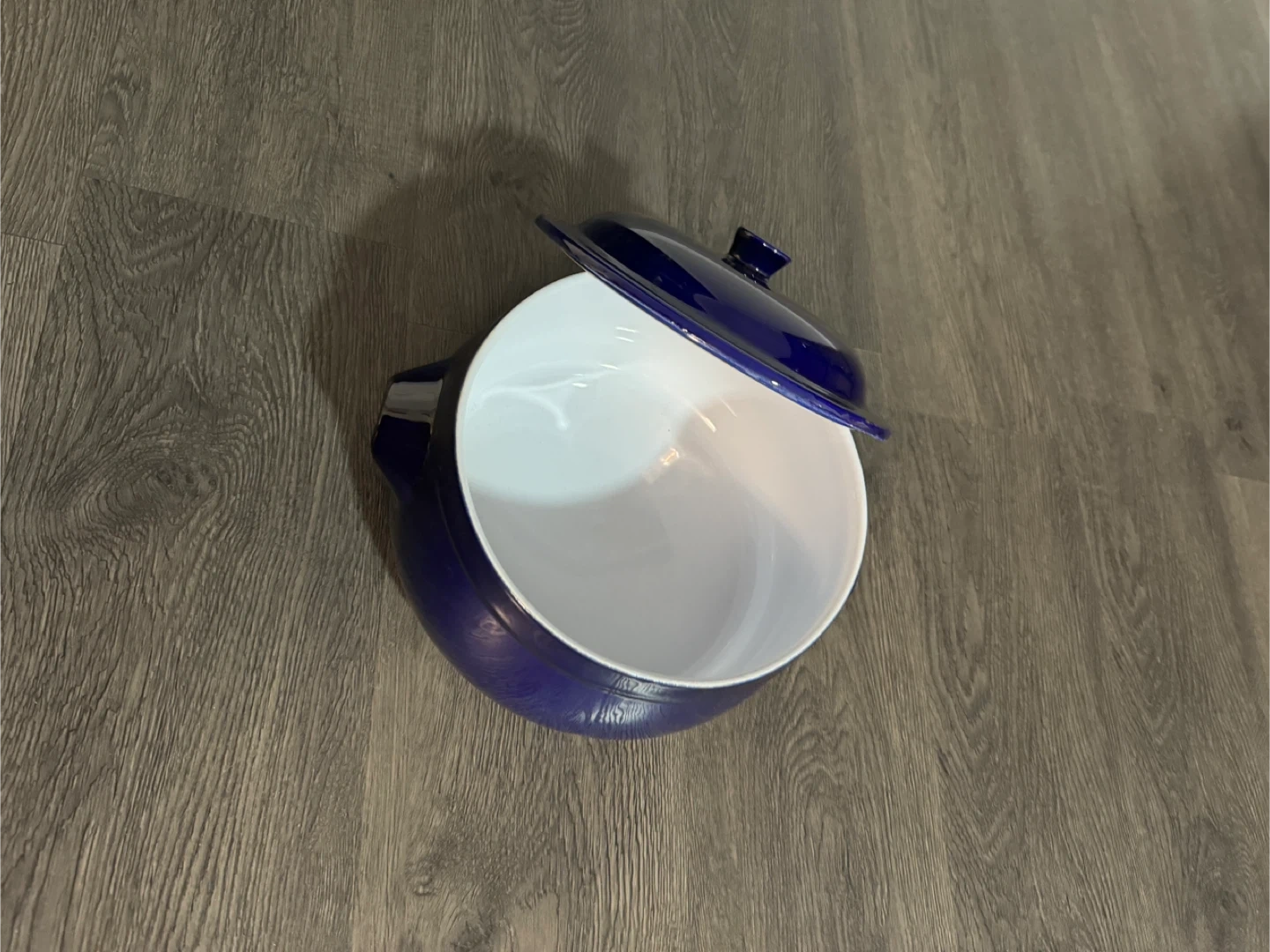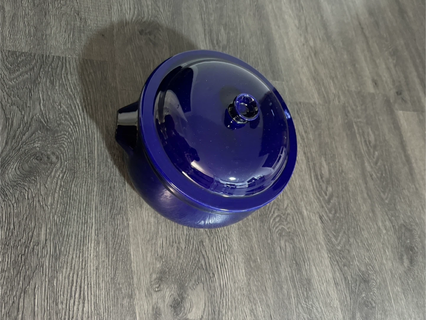 A charming blue ceramic pot with a lid. It's perfect for serving or small batch cooking. Measures approximately 7 inches tall with the lid on.