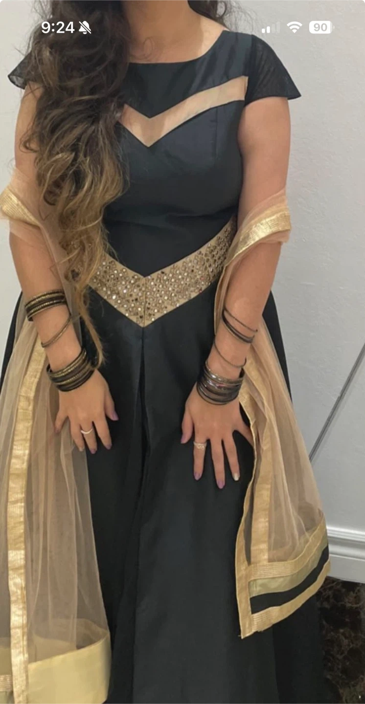Elegant black Anarkali dress with intricate gold detailing. It features a flowing silhouette and comes with a complementary sheer dupatta with gold trim. This outfit is perfect for festive occasions and celebrations.