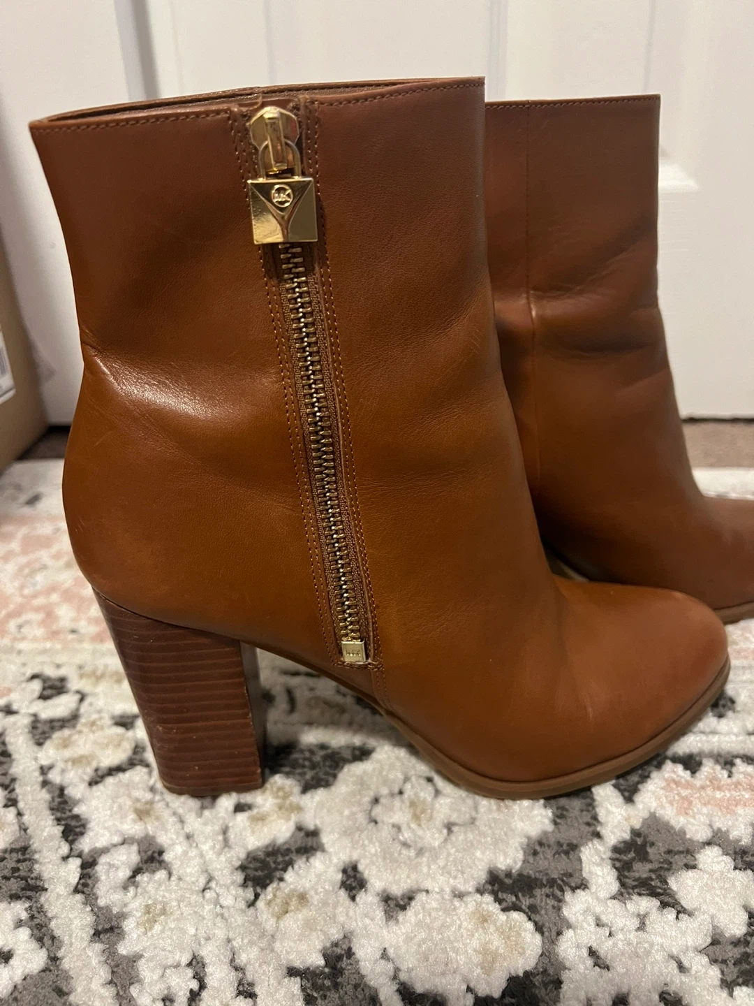 Selling a pair of Michael Kors boots in brown leather. They have a stylish zipper detail and a comfortable heel. These boots are perfect for adding a touch of elegance to your outfit!