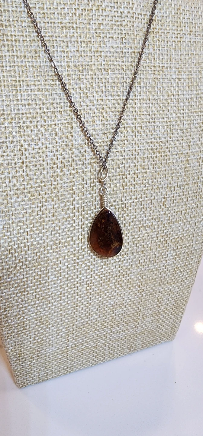 Here's a lovely necklace featuring a teardrop-shaped anber pendant. The pendant is wire-wrapped and hangs from a delicate chain. It's a beautiful and unique piece!