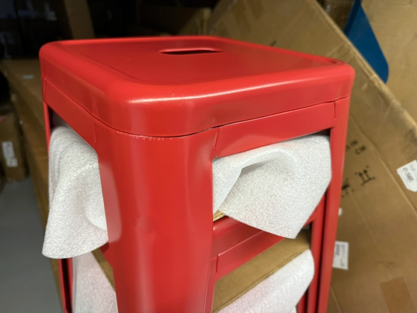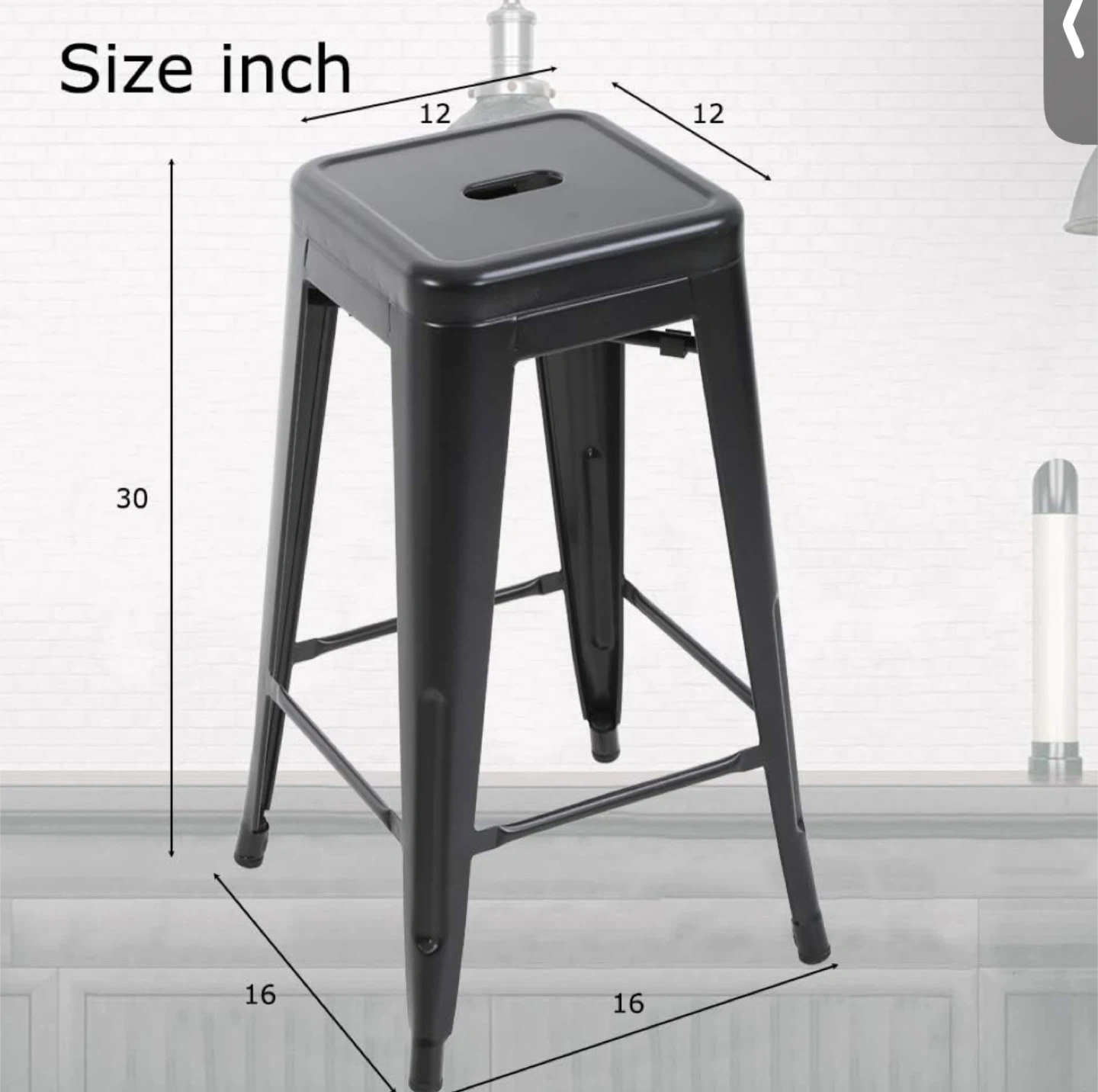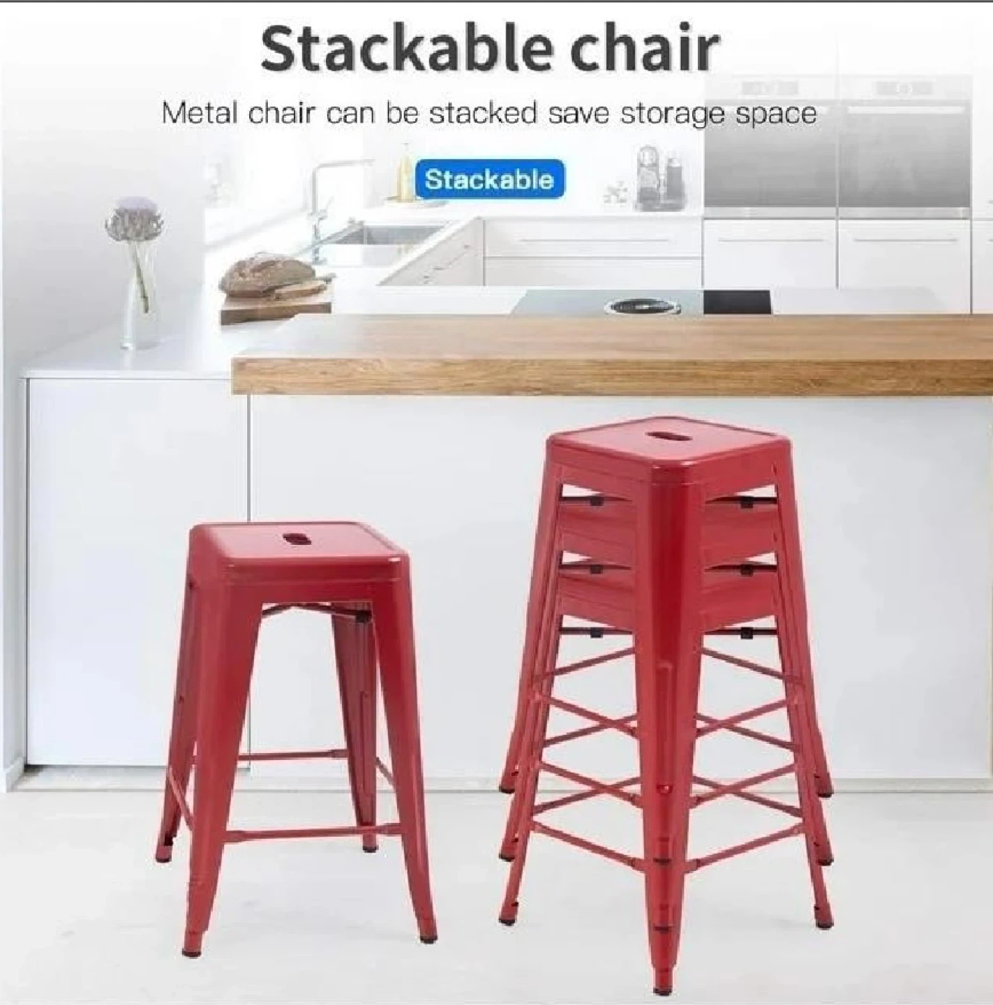 Elevate your space with this new four 30-inch metal bar stools in a vibrant red finish, still in its original packaging. These stools are perfect for adding a modern, industrial touch to your kitchen, bar area, or entertainment space. The sturdy metal construction ensures durability and stability, while the sleek design complements any decor.