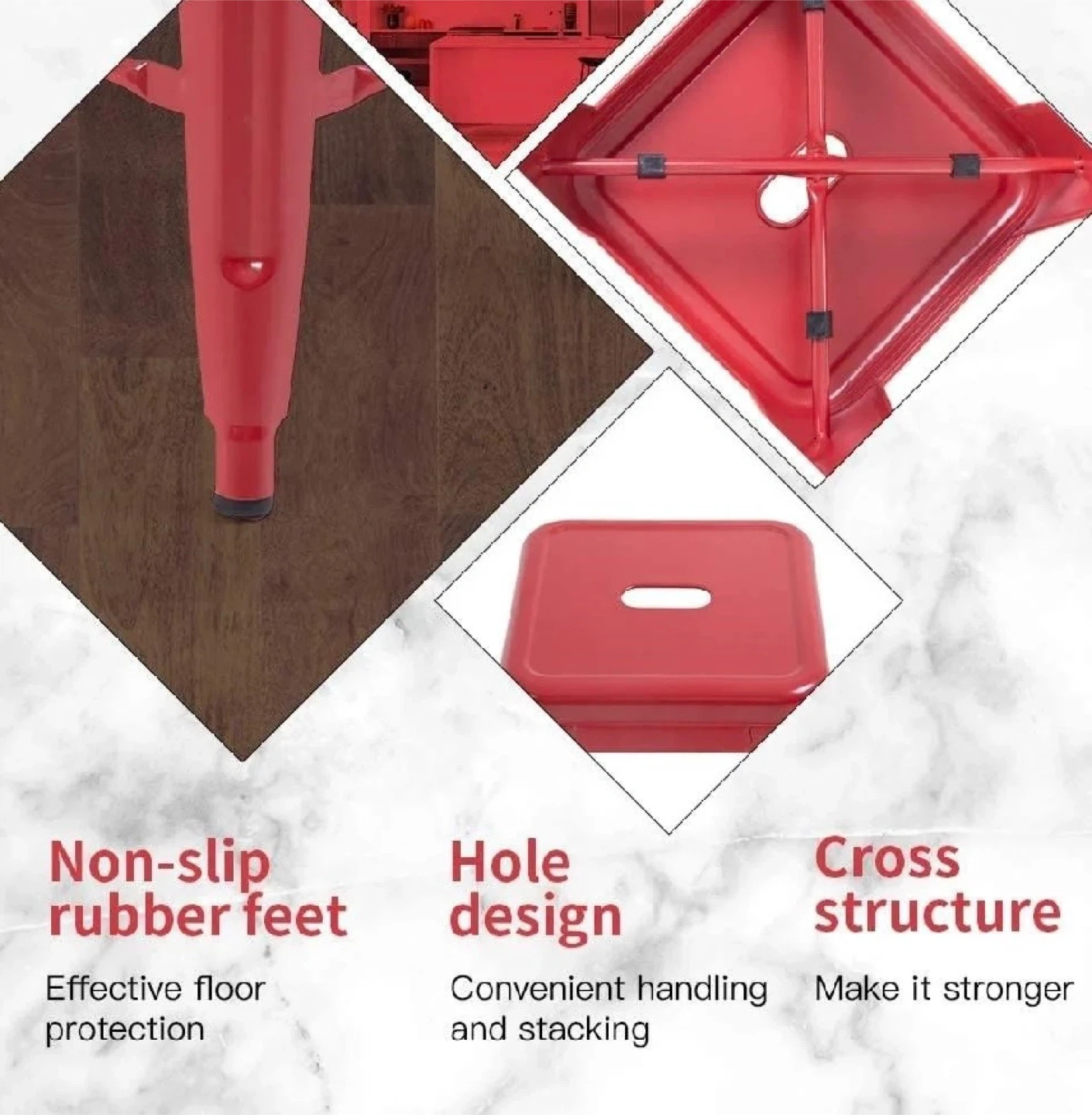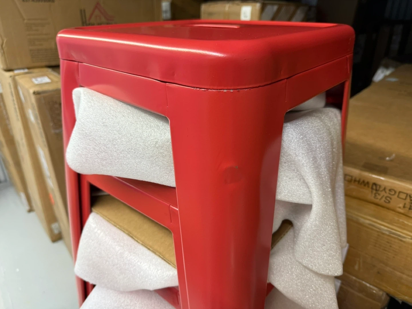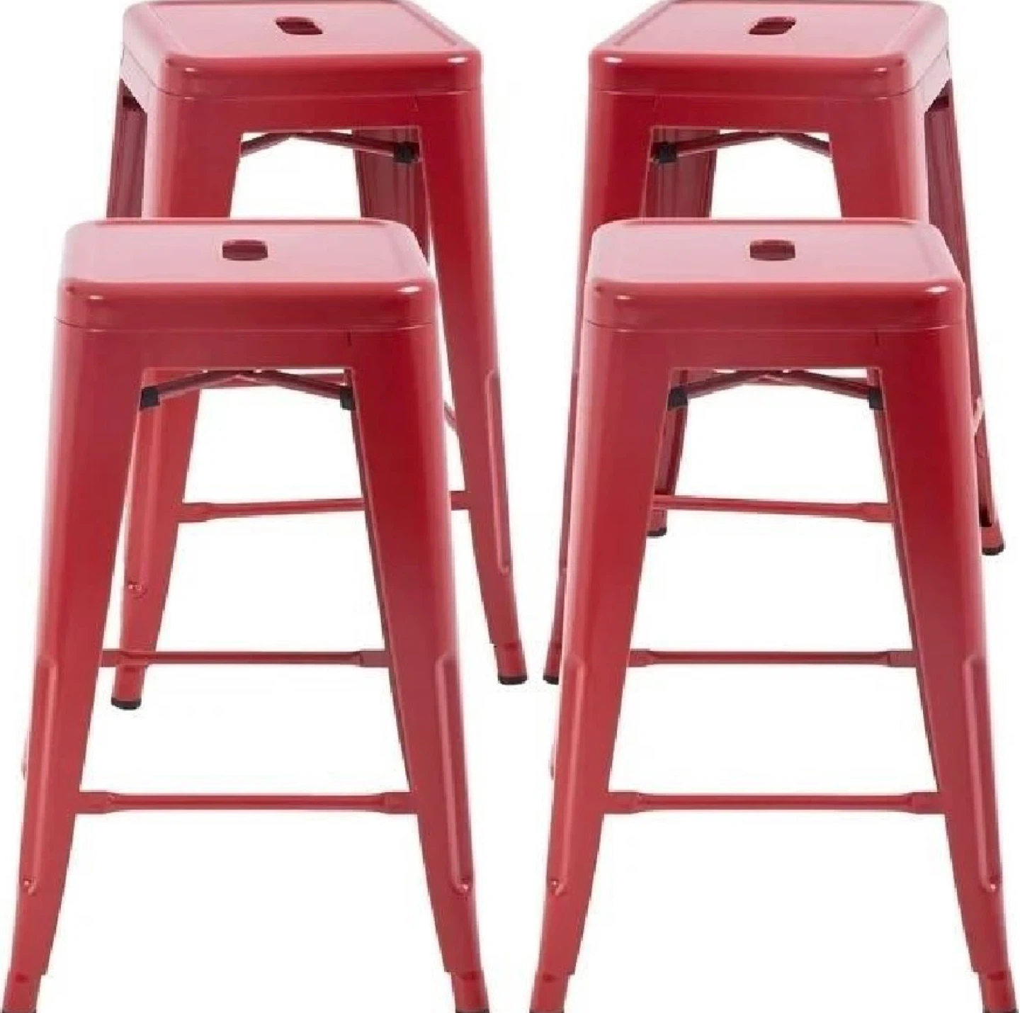 Elevate your space with this new four 30-inch metal bar stools in a vibrant red finish, still in its original packaging. These stools are perfect for adding a modern, industrial touch to your kitchen, bar area, or entertainment space. The sturdy metal construction ensures durability and stability, while the sleek design complements any decor.
