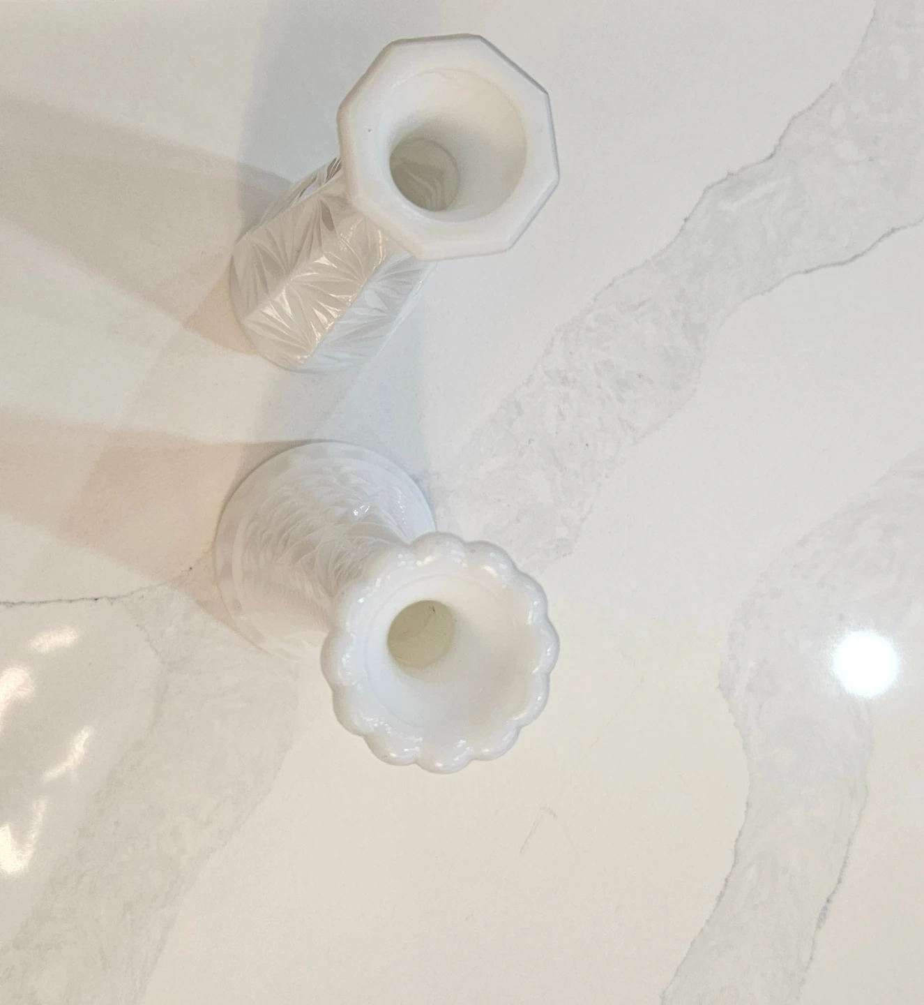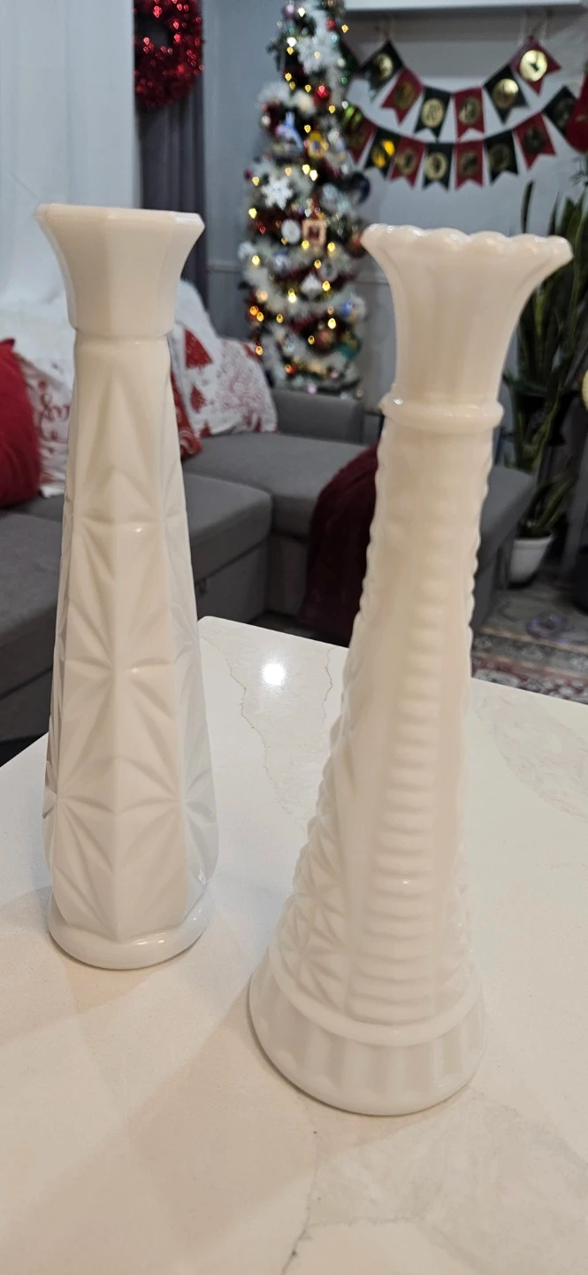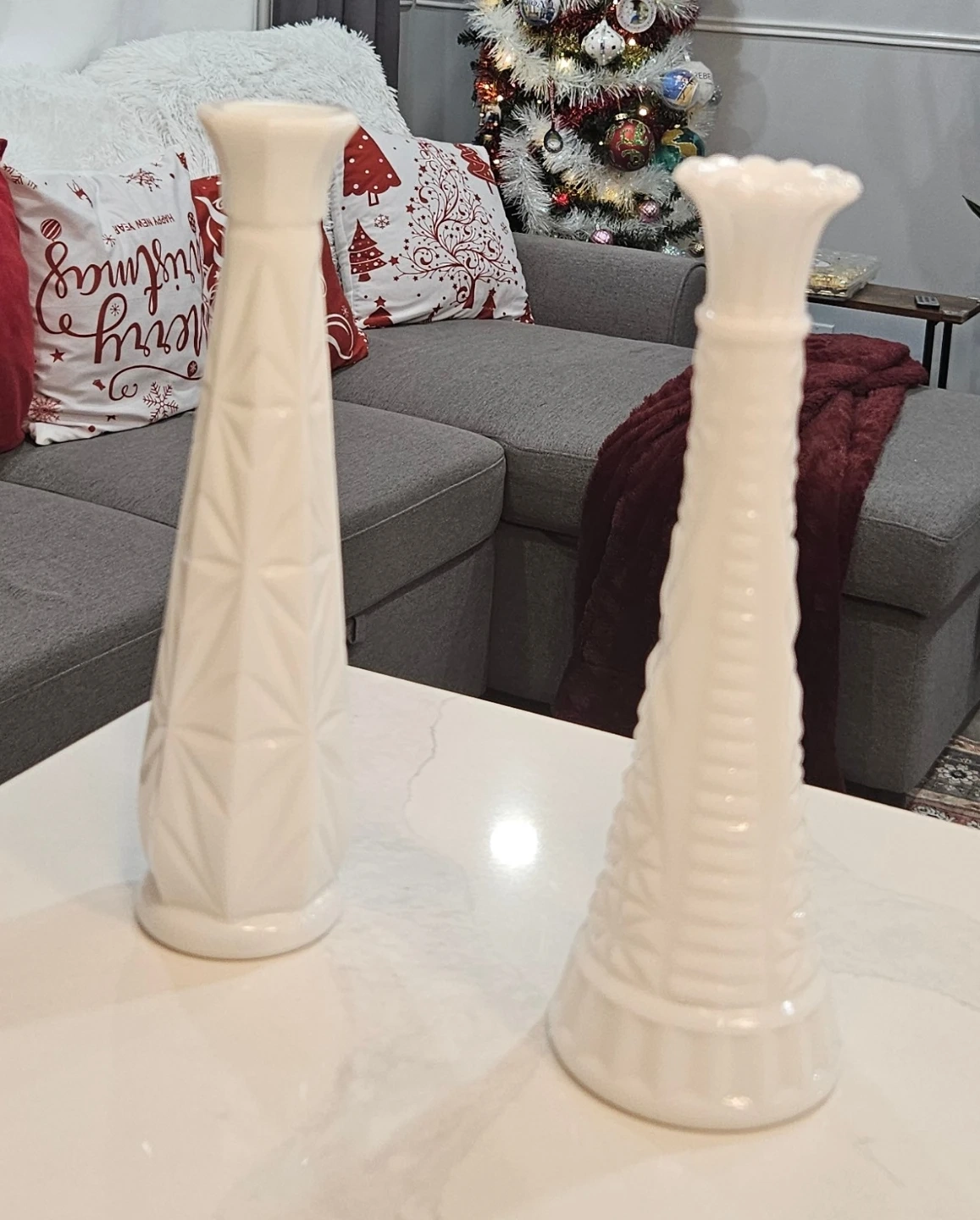 Selling a set of two beautiful vintage milk glass vases. They are in great condition and would be a lovely addition to any home decor! The vases have a classic design and a smooth, glossy finish.