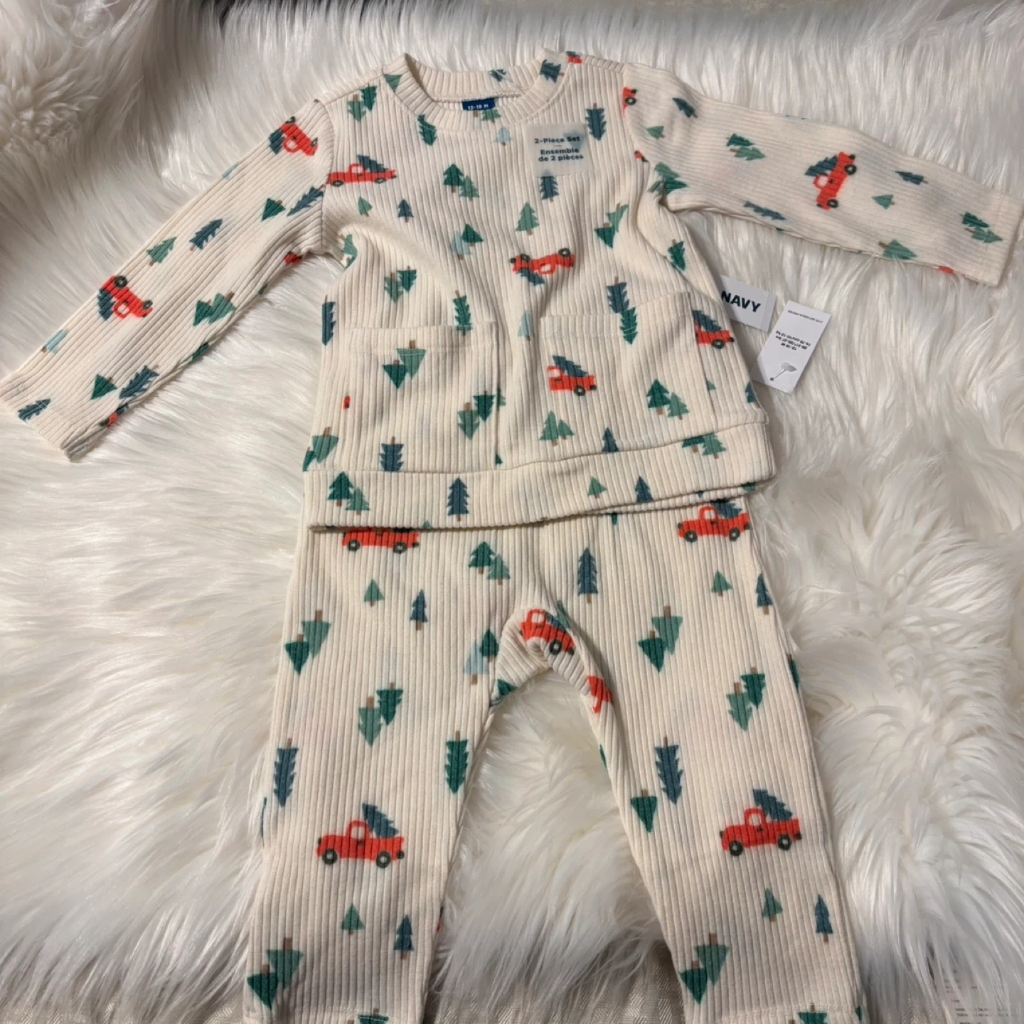 This adorable Old Navy 2-piece set is in excellent condition! It features a cute pattern with trees and cars. The size is 12-18 months, perfect for your little one. Originally bought for $22.99