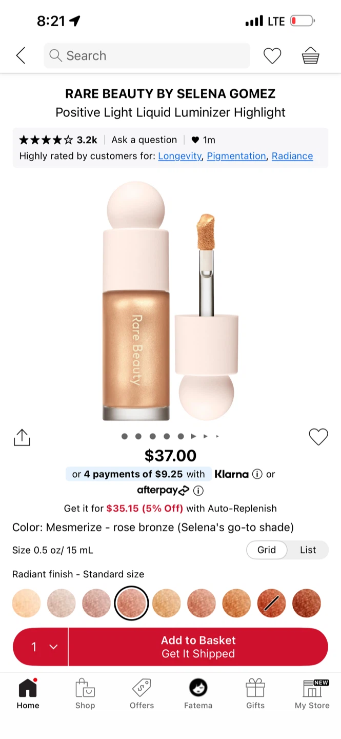 Selling a Rare Beauty Positive Light Liquid Luminizer in the shade Mesmerize. It's a beautiful rose bronze colour that gives a radiant finish.
